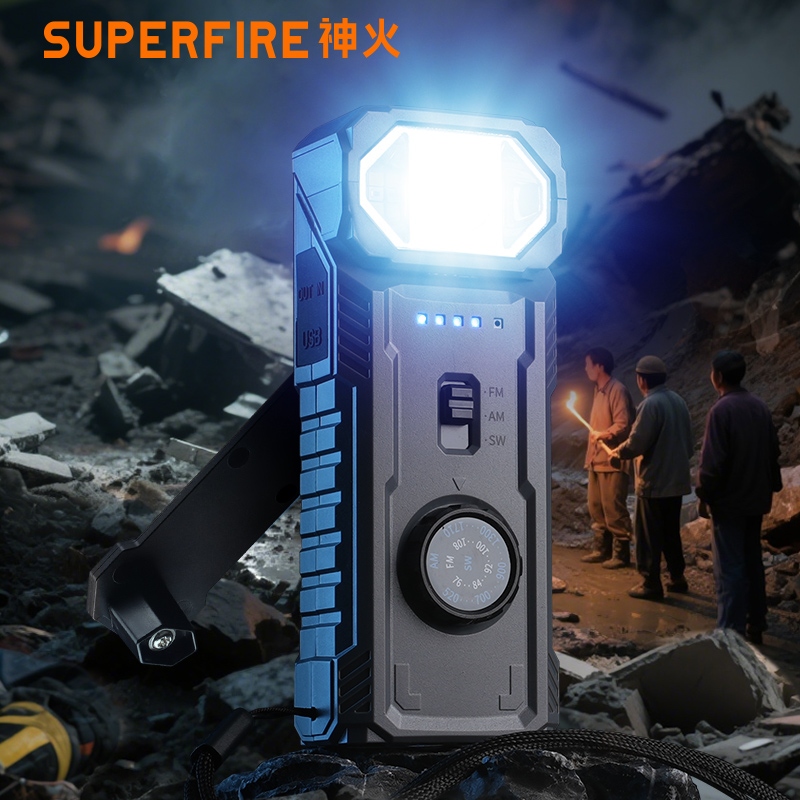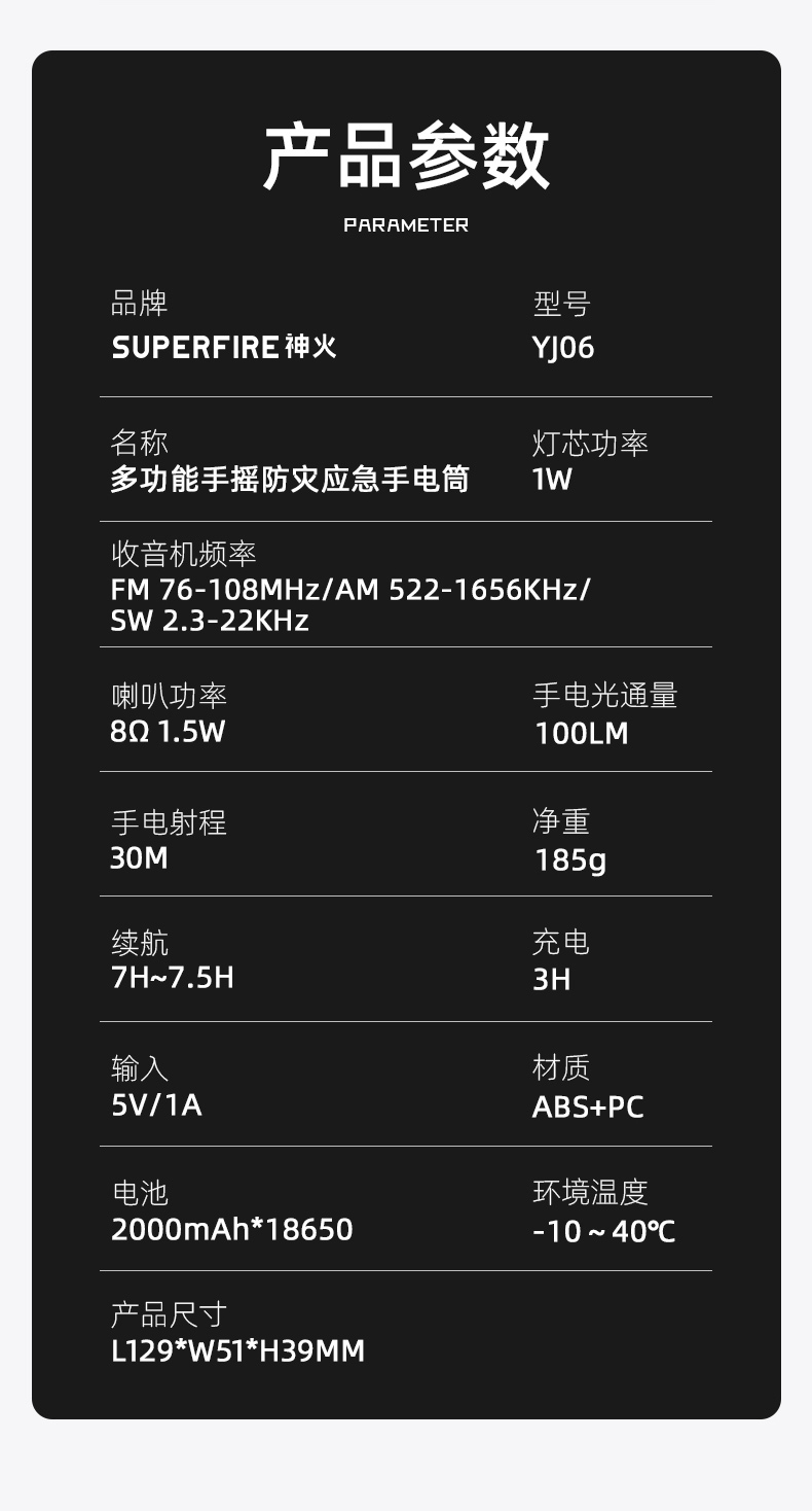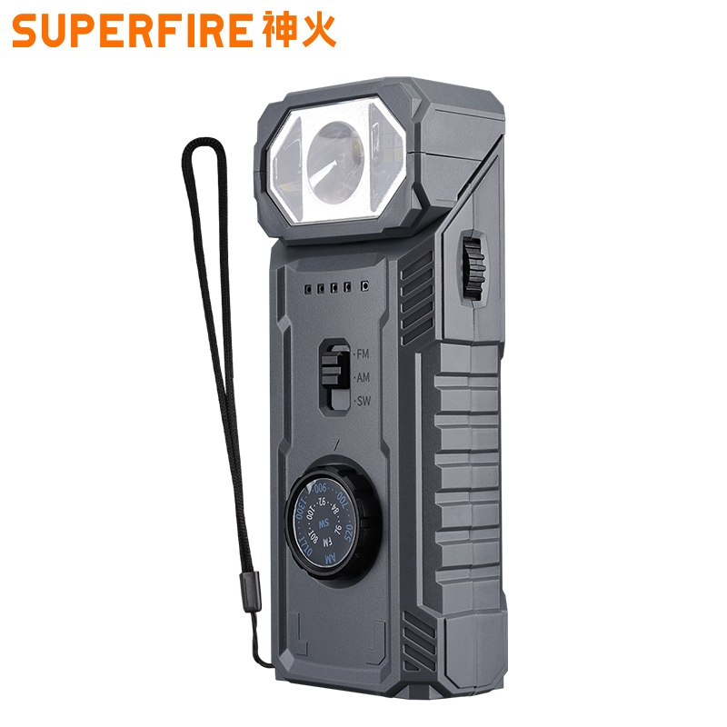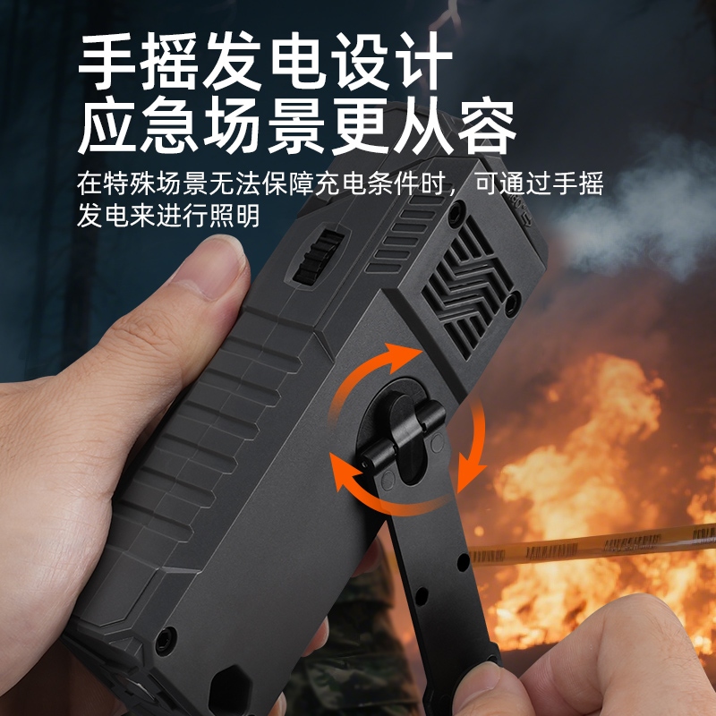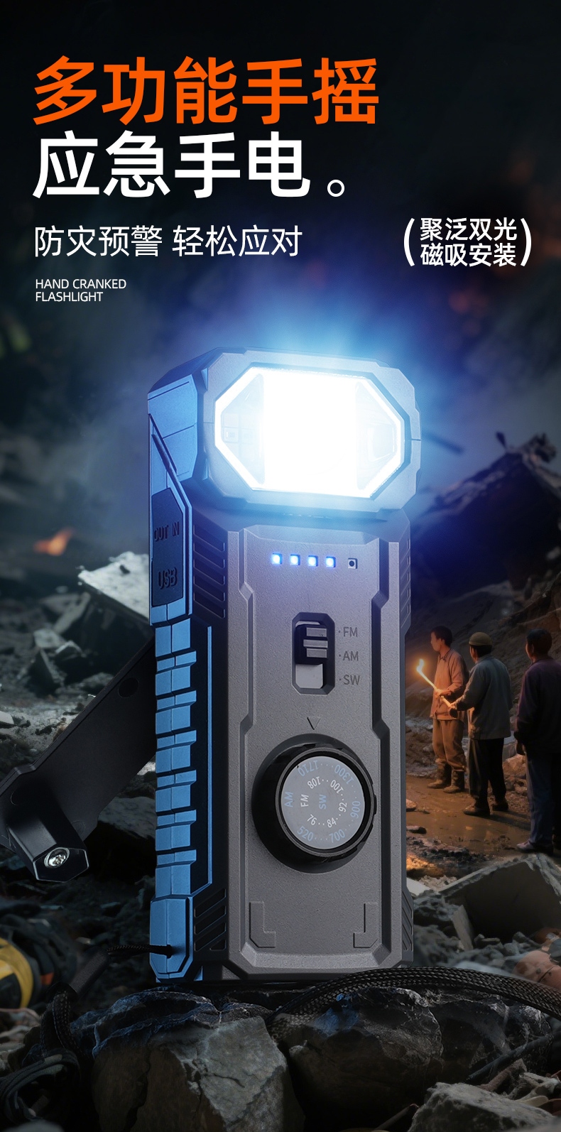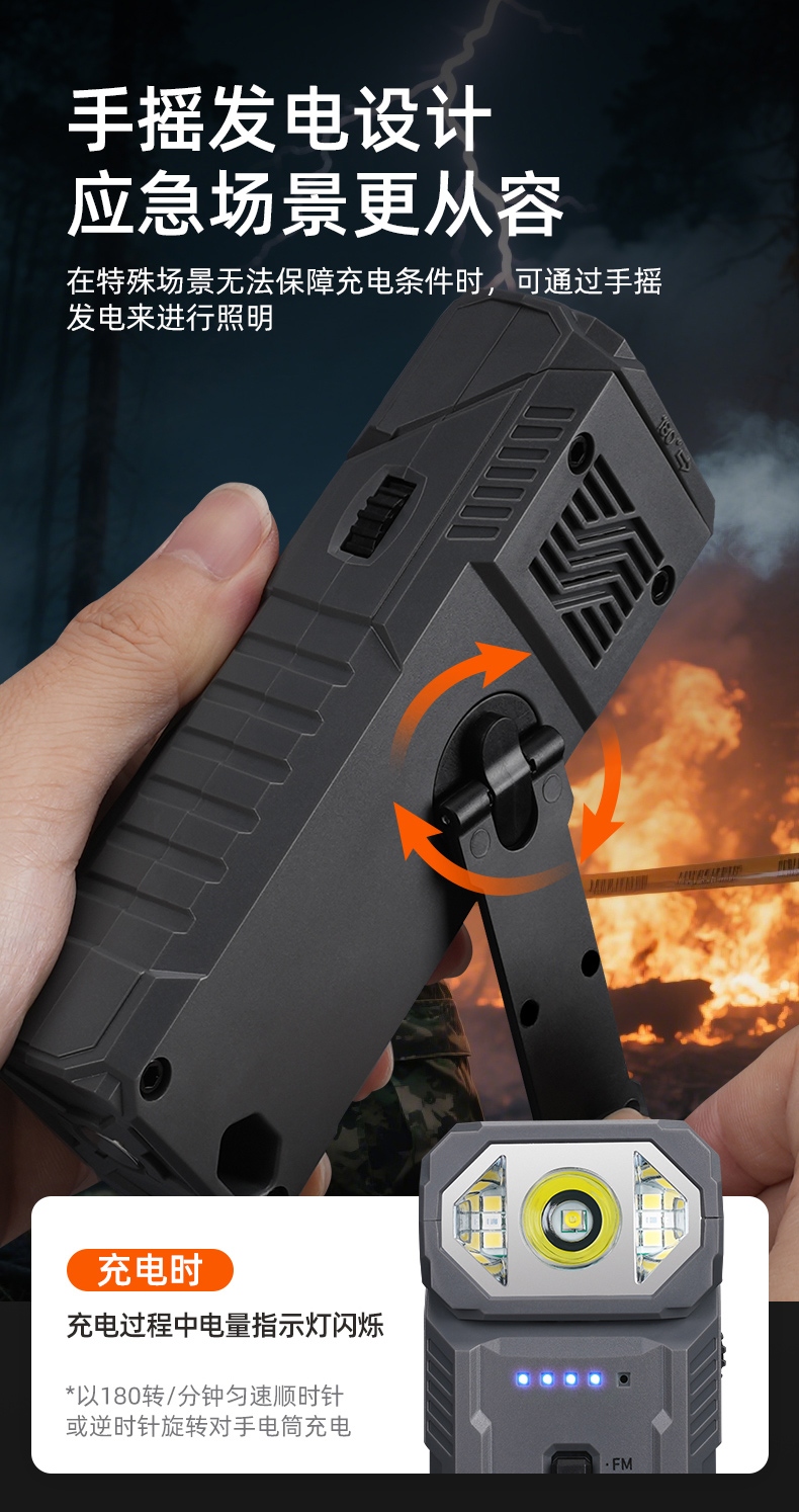 手摇发电(将产品手摇发电手柄打开,以180转/分钟匀速顺时针或逆时针旋转对本机充电,充电过程中电量指示灯闪烁)
