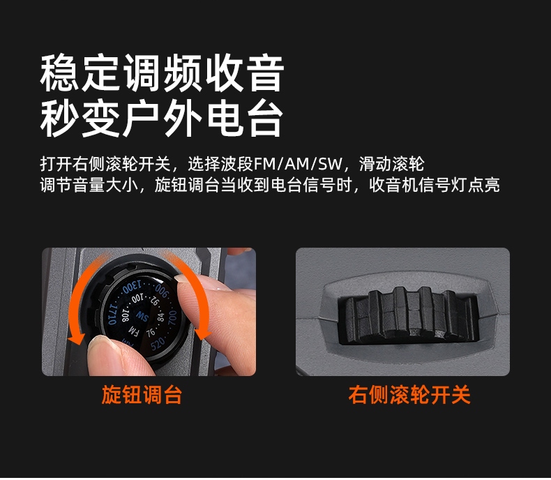 打开收音机右侧滚轮开关,选择波段FM/AM/SW,滑动滚轮调节音量大小,旋钮调台,当收到电台信号时,收音机信号灯点亮。