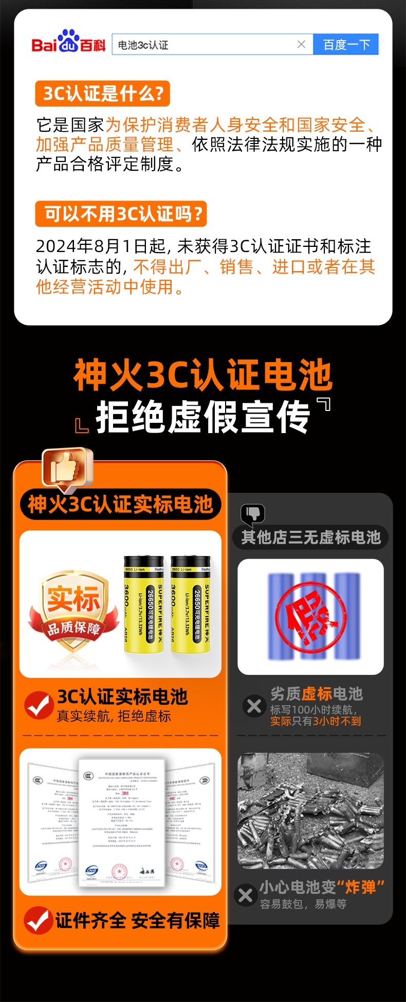 1、3C认证实标电池,真实续航,拒绝虚标,证件齐全安全有保障、澎湃性能、标准电压动力强劲;