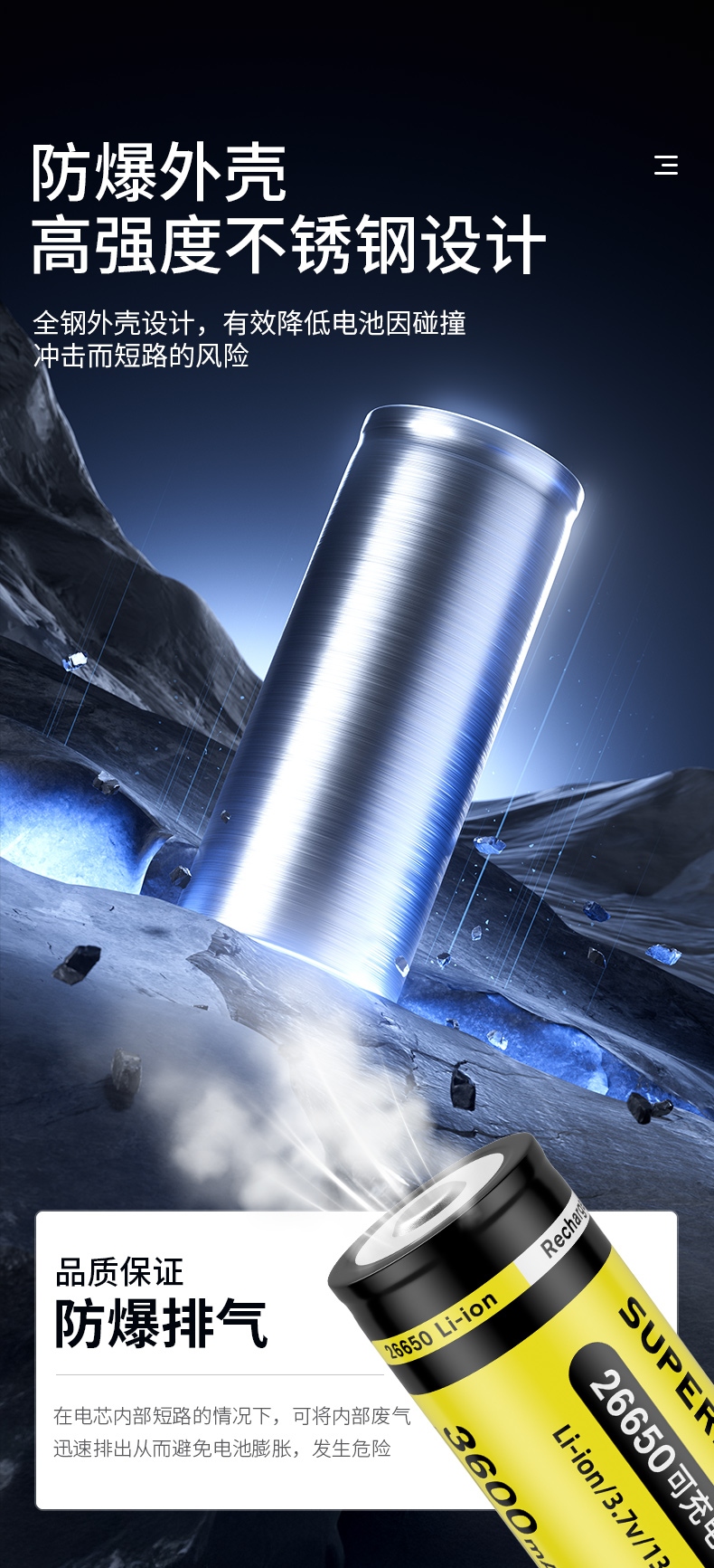 2、防爆外壳,高强度不锈钢设计,有效降低电池因碰撞,冲击而短路的风险;