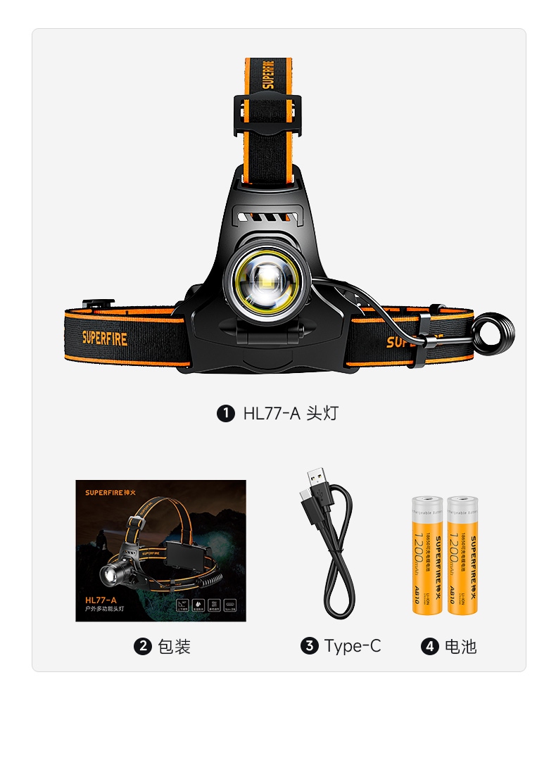 强光亮度,运动头灯,前后均衡设计,轻便不压头,可调节式头灯带,佩戴方便舒适,伸缩调焦,光照范围大,照射距离远,头灯角度调节,超90度角度随意调节,适宜各种环境使用