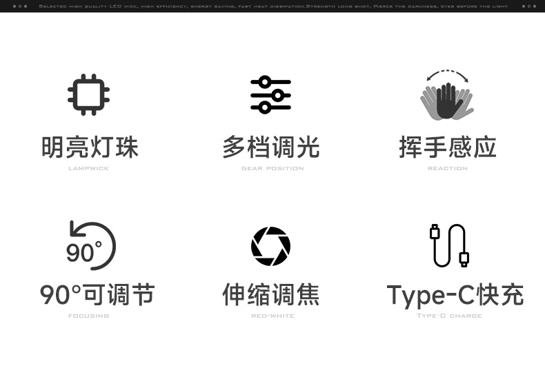 1、六档调光,可满足不同使用场景下的照明需求。 2、进口高亮朗明纳斯灯珠,照明效果更好。 3、含档位记忆,任意档位快捷关机 ,开机恢复关机前档位。