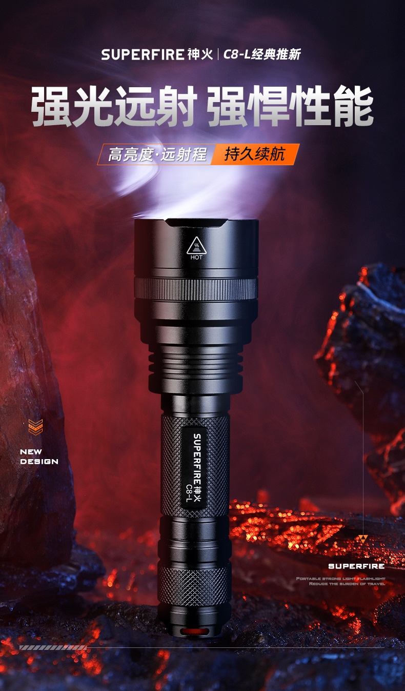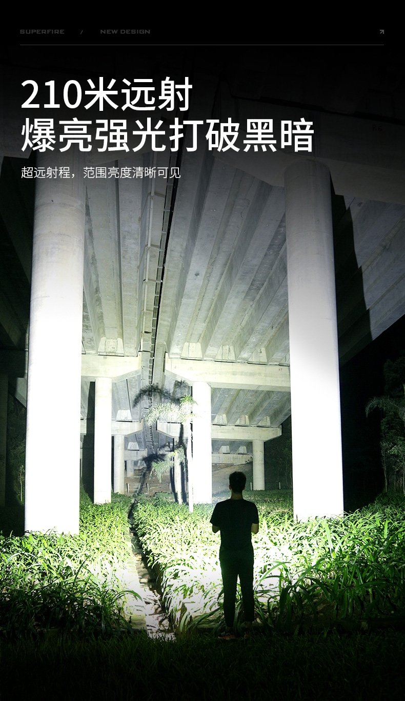 1、千米远射,射程更远,光斑更聚焦。 2、进口灯珠,亮度高,照明效果更好。 3、前后双按键,光源一键点亮,高亮瞬间开启。