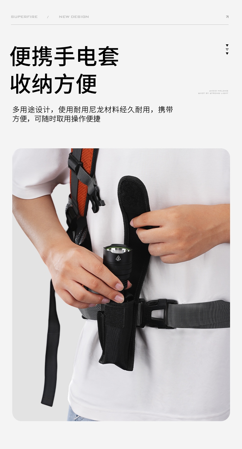 1、强光-中光-弱光-爆闪-SOS五档调光,可满足不同场景需要。