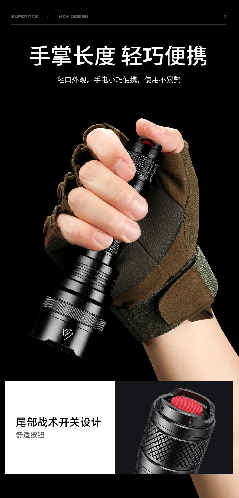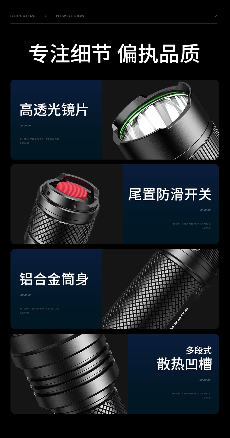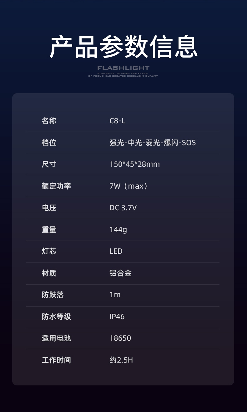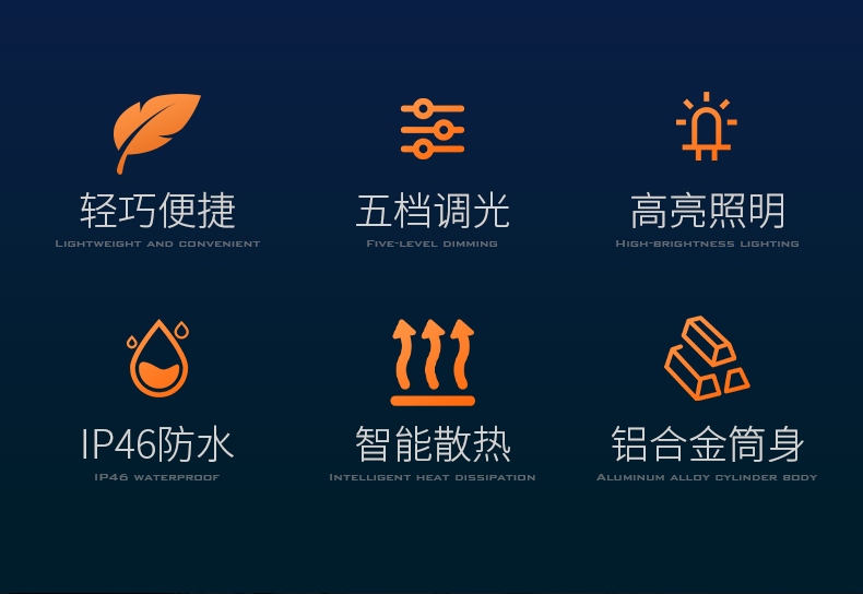 1、强光-中光-弱光-爆闪-SOS五档调光,可满足不同场景需要。 2、铝合金外壳,防水耐摔。 3、经典外观,小巧便携。