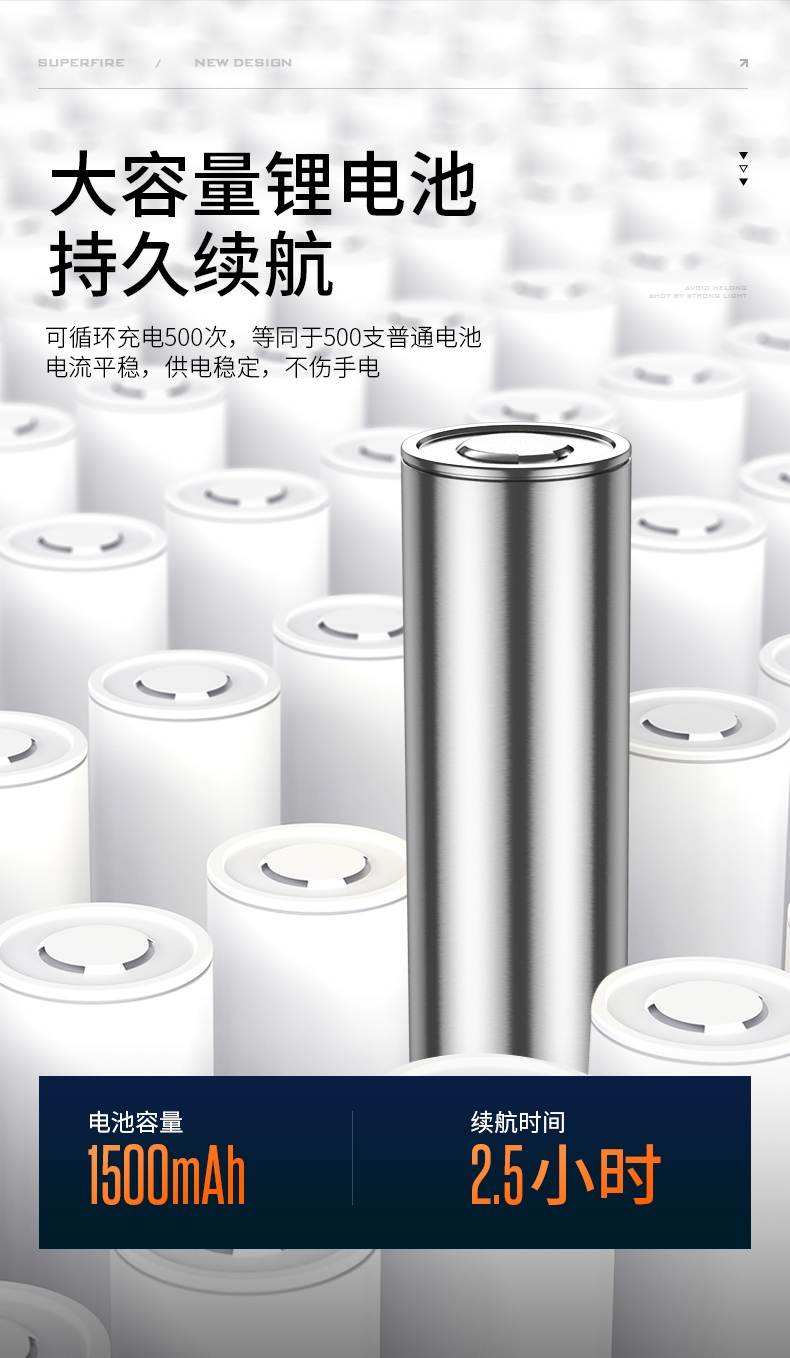 聚光主灯 亮度随心 轻按后端开关按钮,主灯强光点亮,续按依次切换主灯工作光-爆闪光。主灯开启状态下长按5秒,可实现光源色温转换。主灯关闭状态下长按5秒,可开启灯具最亮照明模式。 爆亮强光 亮如白昼 1500LM大功率高亮光源,点亮顷刻如白昼