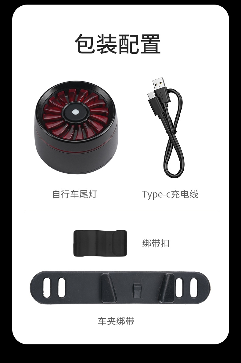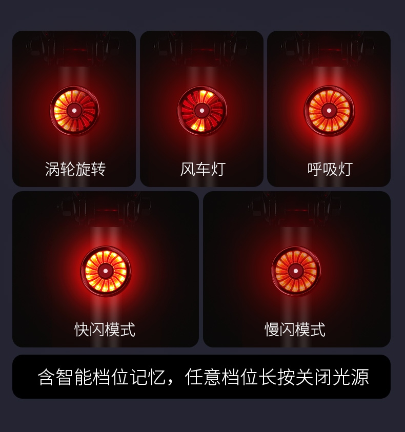 按开关键开启光源,挡位依次:涡轮旋转-风车-呼吸灯-快闪-慢闪-循环,任意挡位下长按关闭。灯具自带挡位记忆功能,再次开启时为之前关闭挡位;