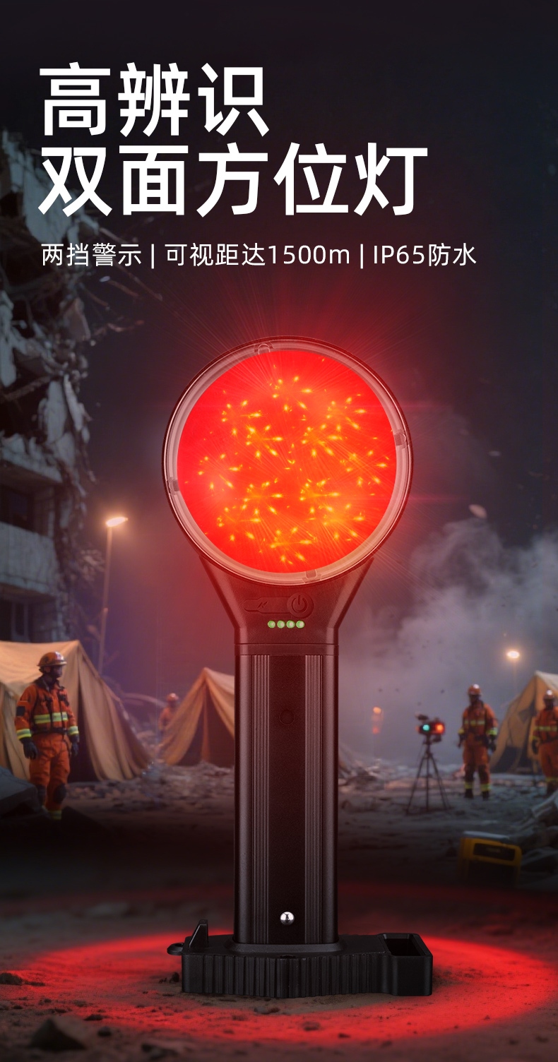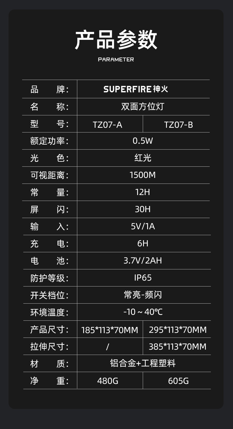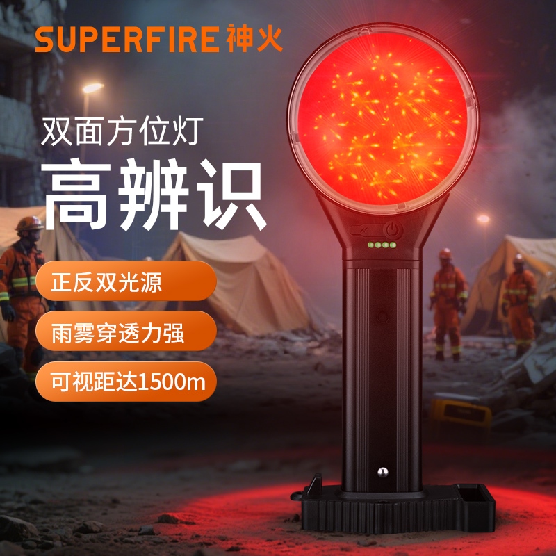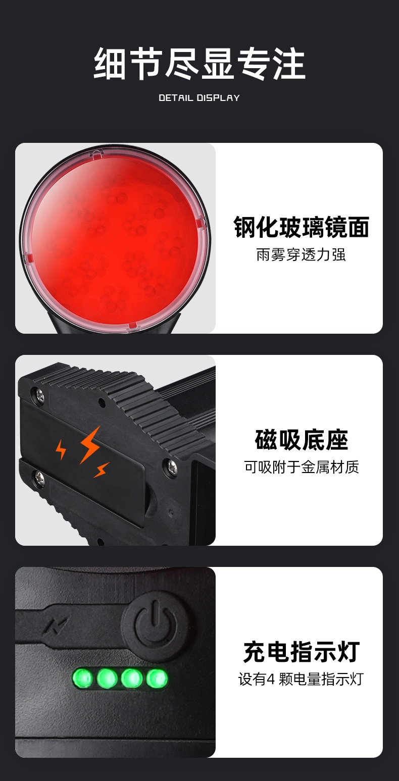 正反两面发光,单向可视距离达1500米,灯头可伸缩9CM,雨雾穿透力强,两挡灯光,钢化玻璃镜片,可磁吸安装,可挂装