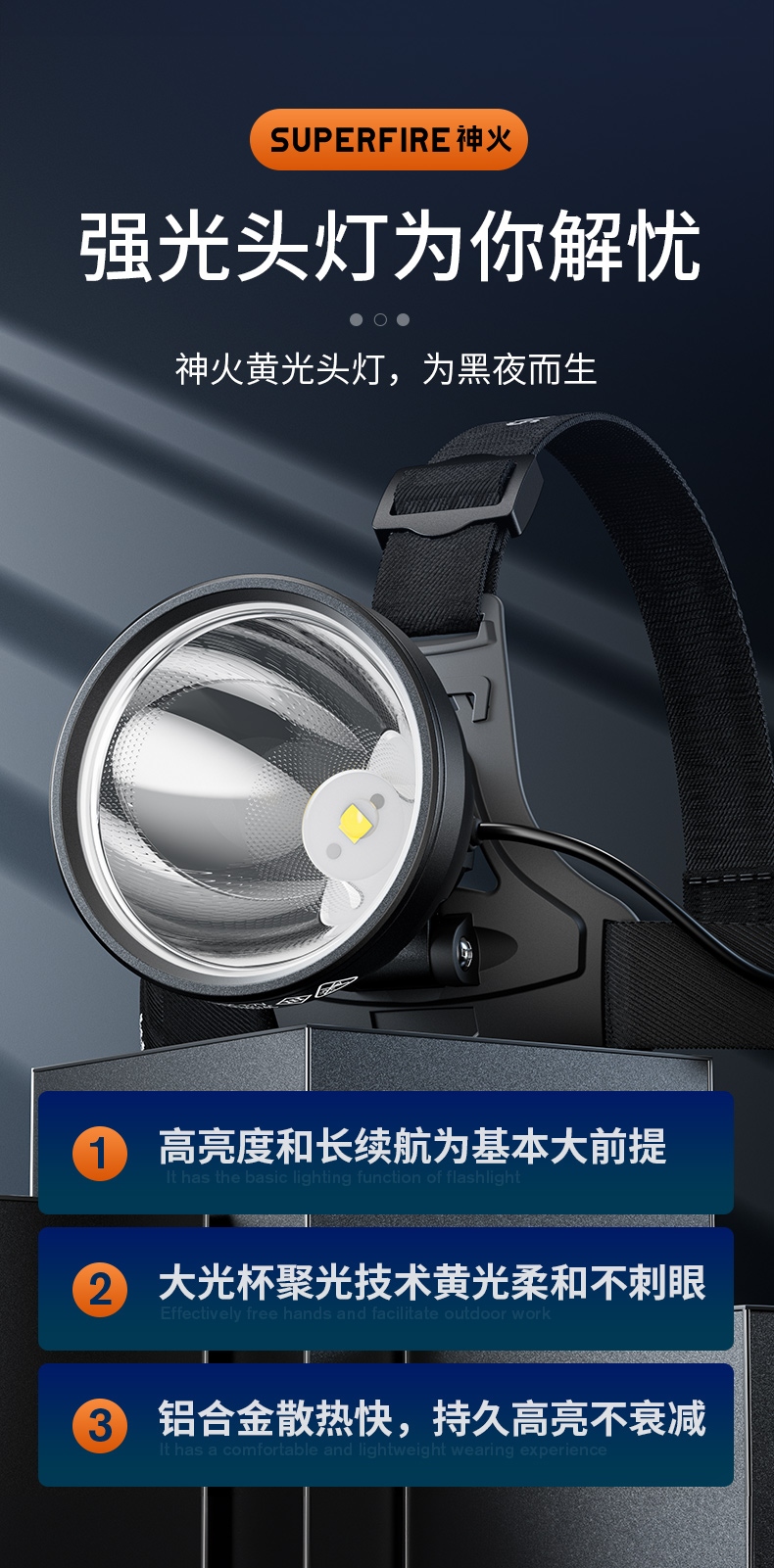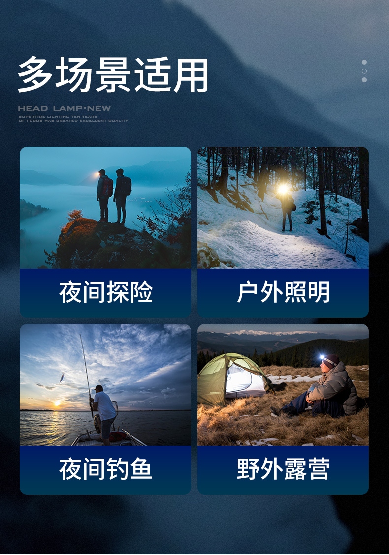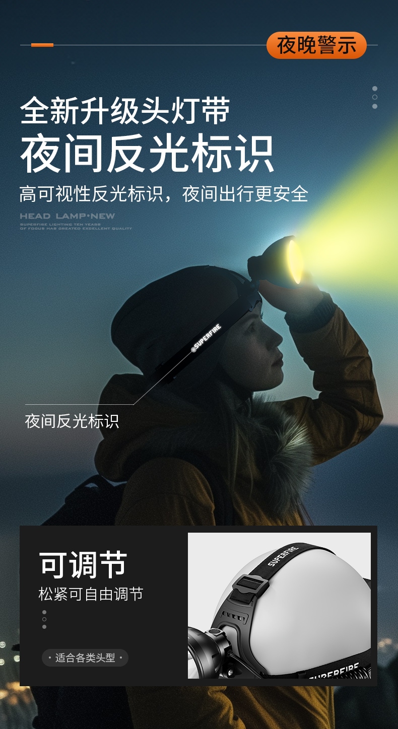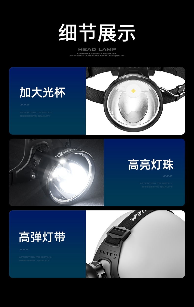 强光亮度,运动头灯,前后均衡设计,轻便不压头,可调节式头灯带,佩戴方便舒适,伸缩调焦,光照范围大,照射距离远,头灯角度调节,超90度角度随意调节,适宜各种环境使用