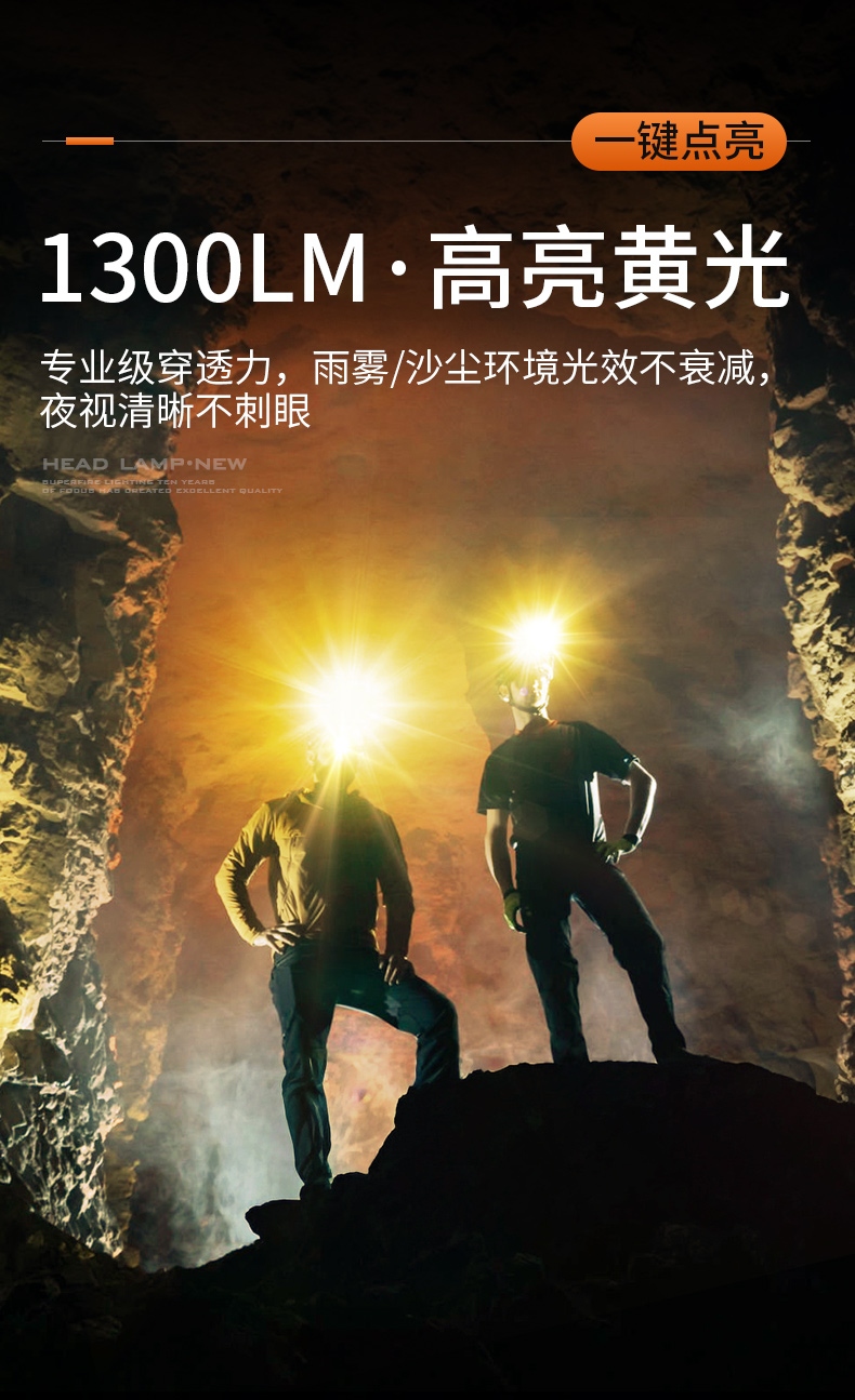 聚光主灯 亮度随心 轻按后端开关按钮,主灯强光点亮,续按依次切换主灯工作光-爆闪光。主灯开启状态下长按5秒,可实现光源色温转换。主灯关闭状态下长按5秒,可开启灯具最亮照明模式。 爆亮强光 亮如白昼 1500LM大功率高亮光源,点亮顷刻如白昼