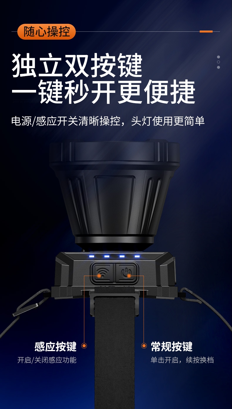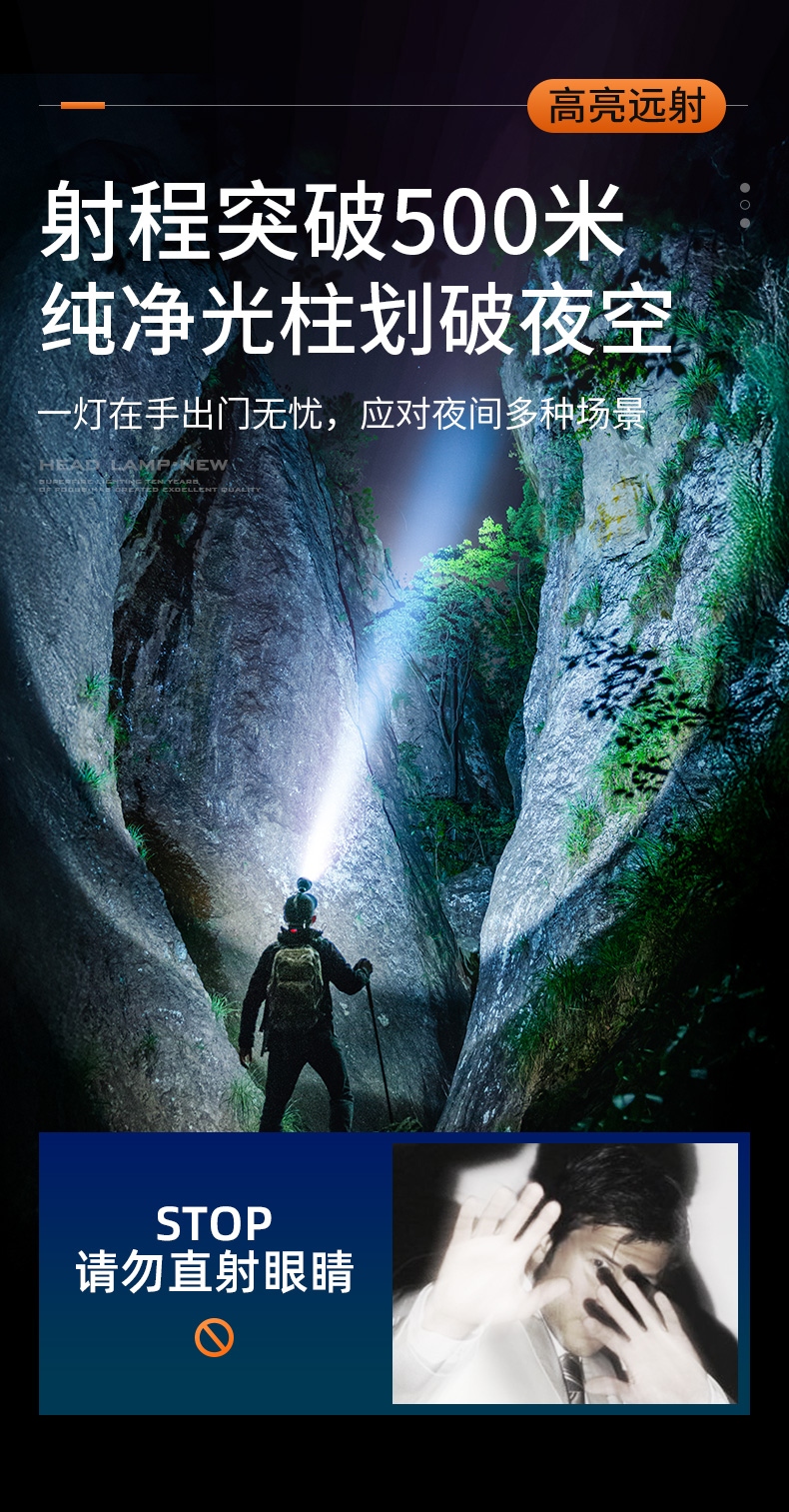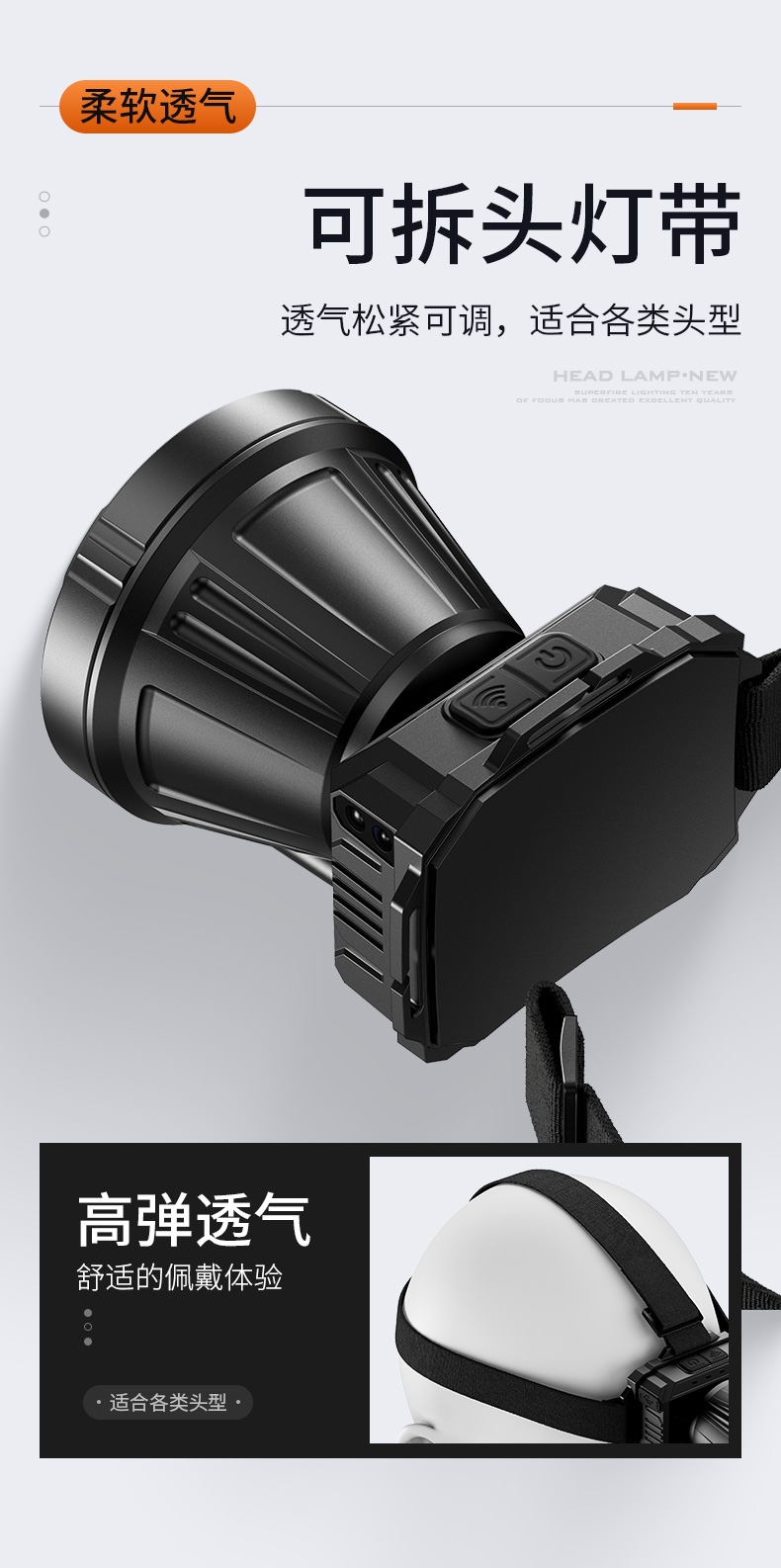 强光亮度,运动头灯,前后均衡设计,轻便不压头,可调节式头灯带,佩戴方便舒适,伸缩调焦,光照范围大,照射距离远,头灯角度调节,超90度角度随意调节,适宜各种环境使用