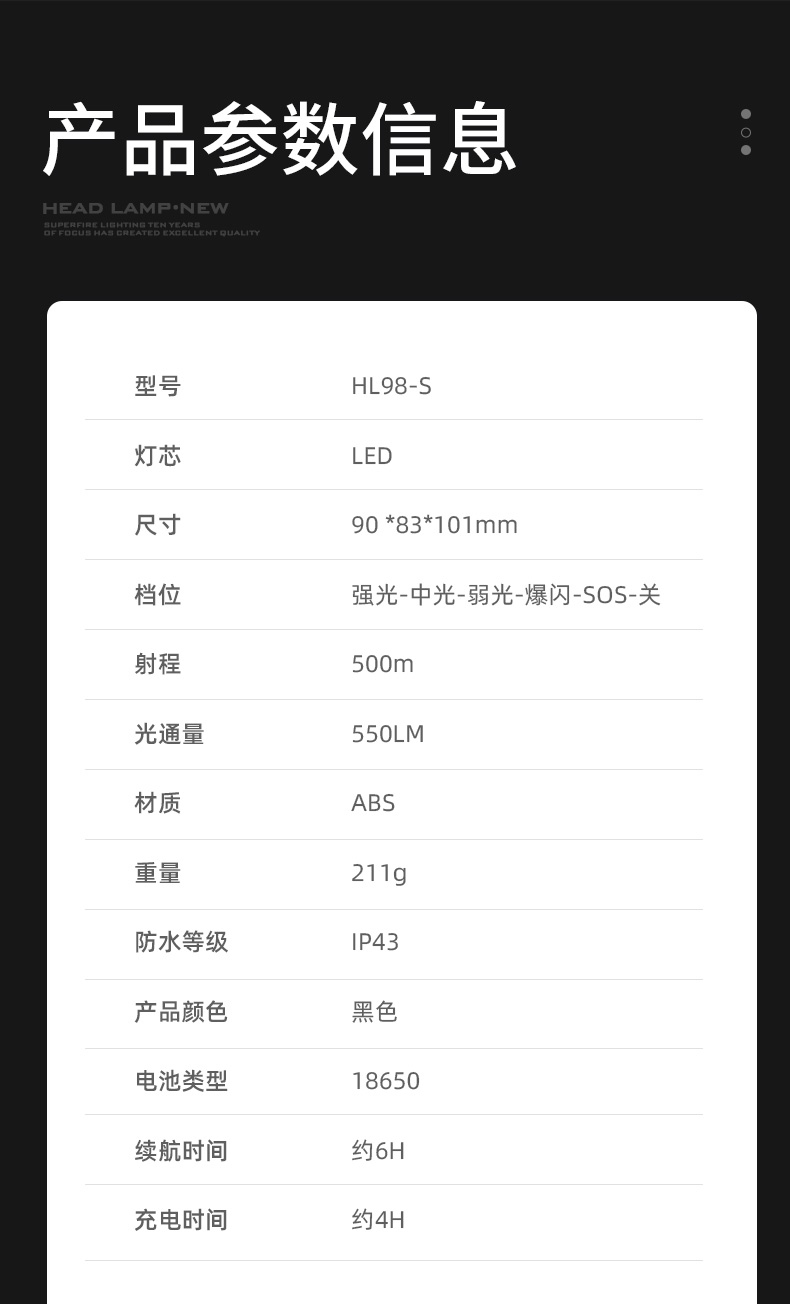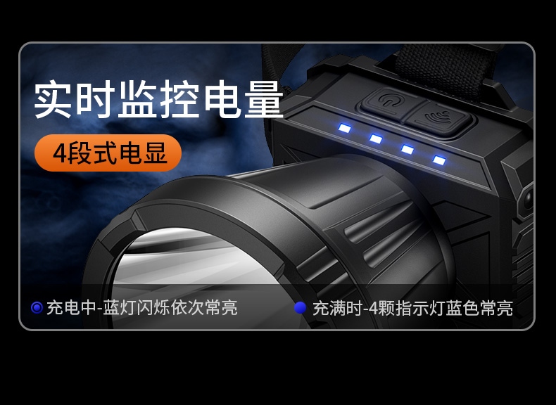 1、五档一体:强中弱、爆闪、SOS自由切换,可满足不同场景下的使用需求。 2、电量显示:实时电显,轻松掌握电量,一目了然。 3、可调节式松紧带:佩戴方便舒适。