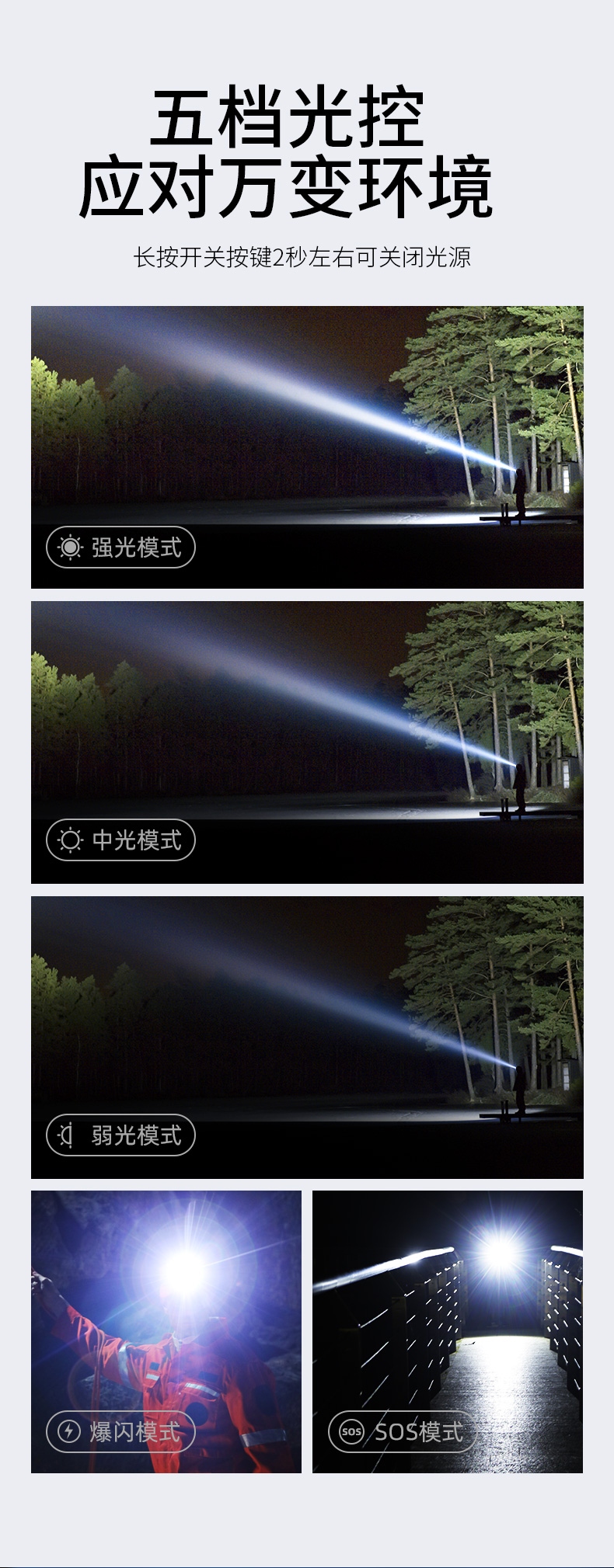1、五档一体:强中弱、爆闪、SOS自由切换,可满足不同场景下的使用需求。