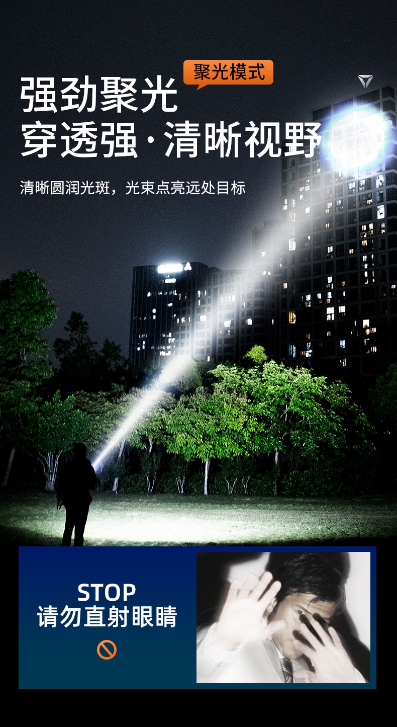 1、千米远射,射程更远,光斑更聚焦。 2、进口灯珠,亮度高,照明效果更好。 3、前后双按键,光源一键点亮,高亮瞬间开启。