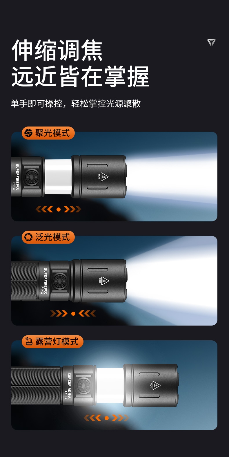 1、两种照明模式,多档调光,可满足不同使用场景下的照明需求。 2、多种安全程序,可有效保护手电使用安全,延长手电使用寿命。 3、单按键设计简单,操作便捷。