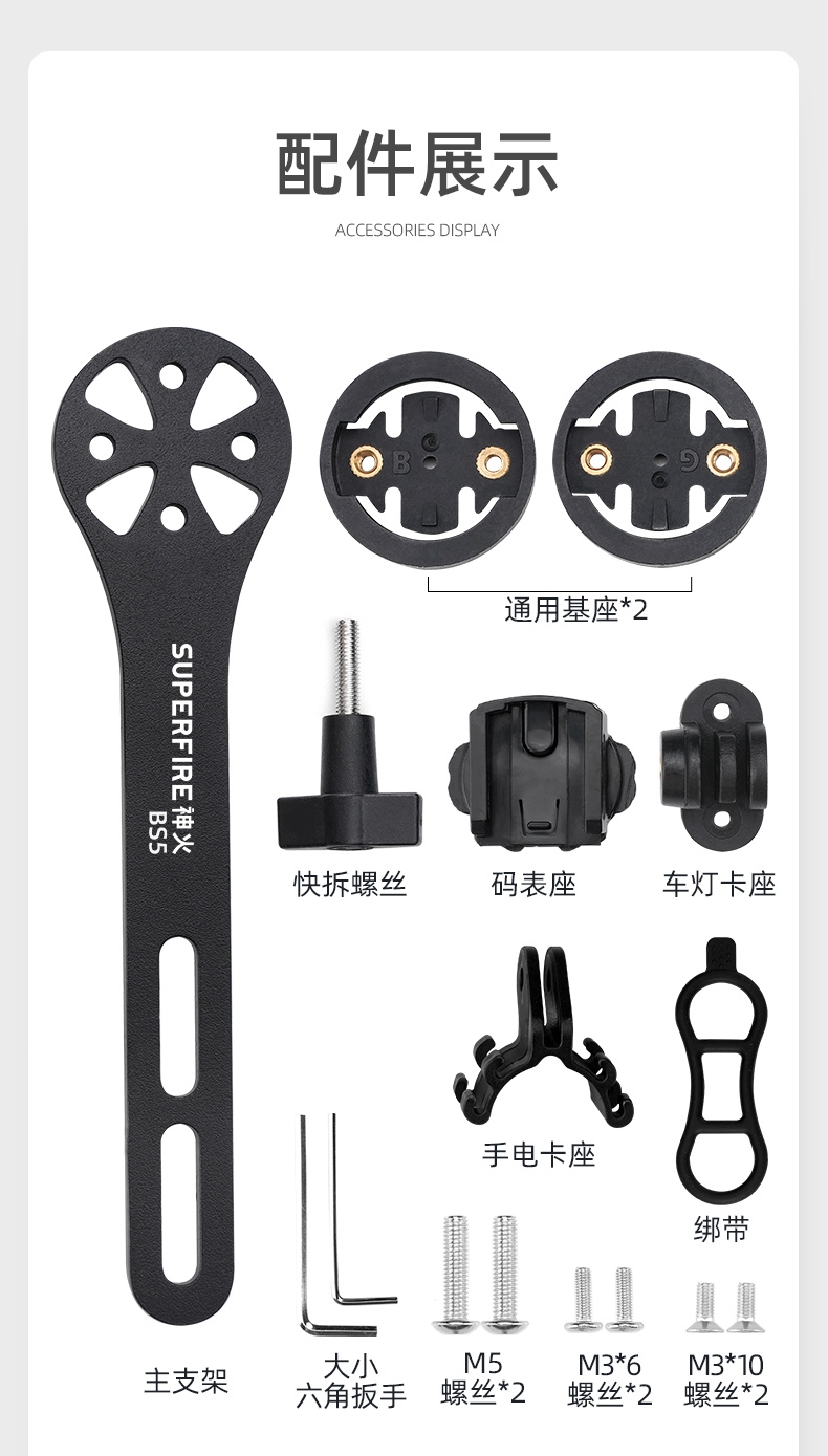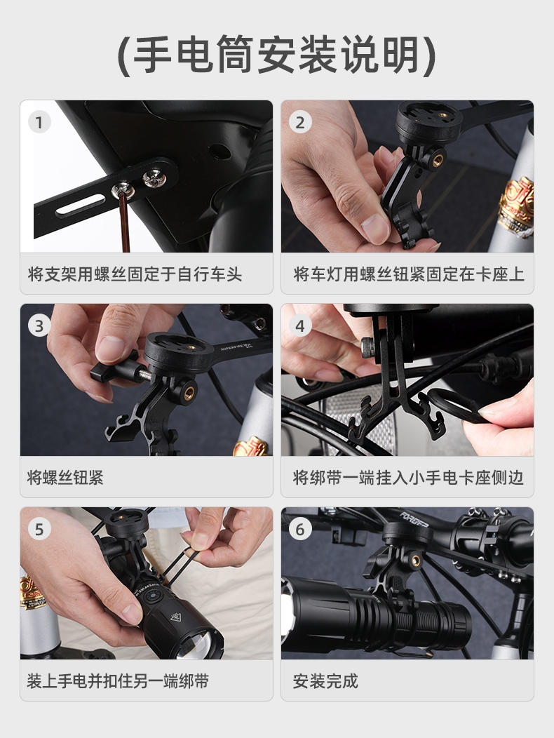 3、六角螺丝便捷锁定,配置下挂接头和手电夹,车灯类型随心选择;