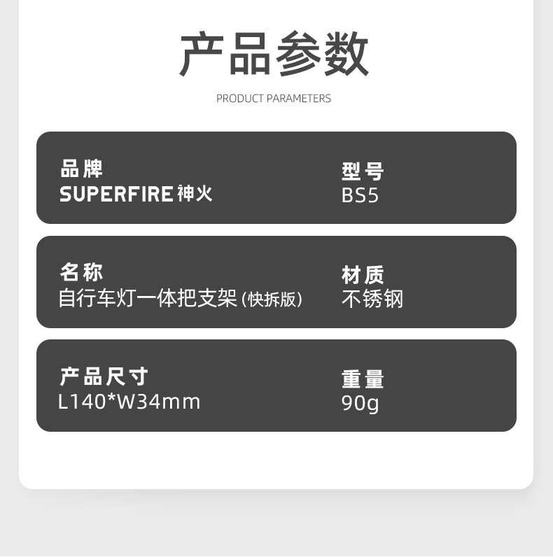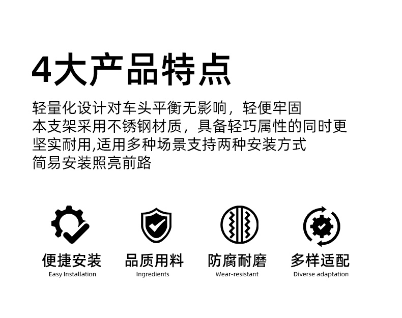 轻量化设计对车头平衡无影响,轻便牢固;本支架采用不锈钢材质,具备轻巧属性的同时更 坚实耐用,适用多种场景支持两种安装方式;