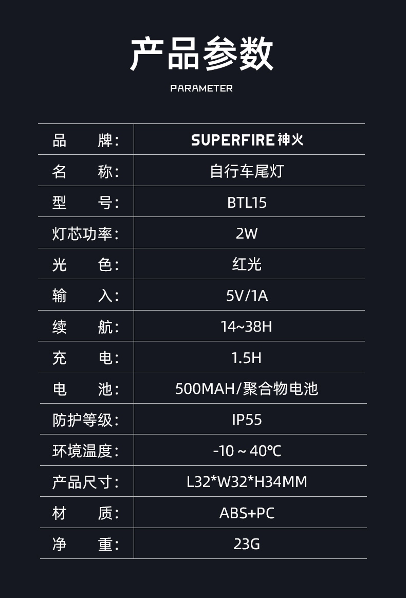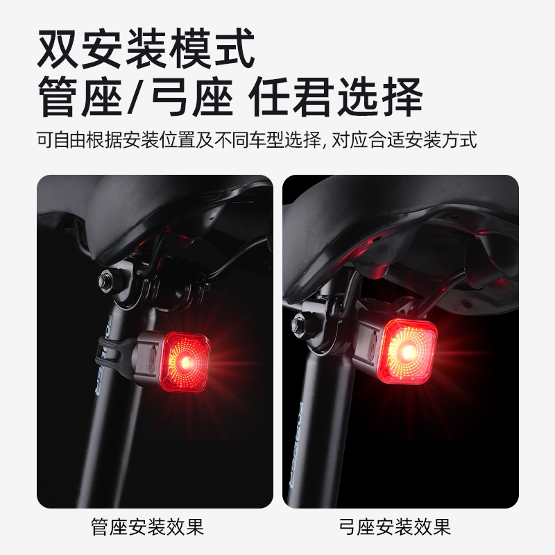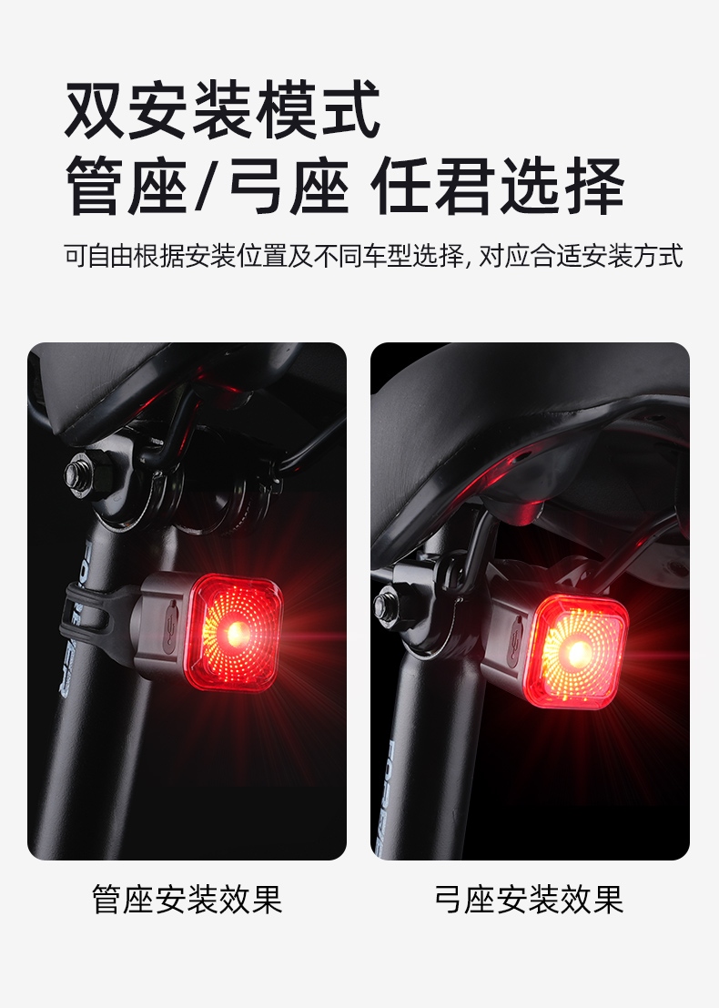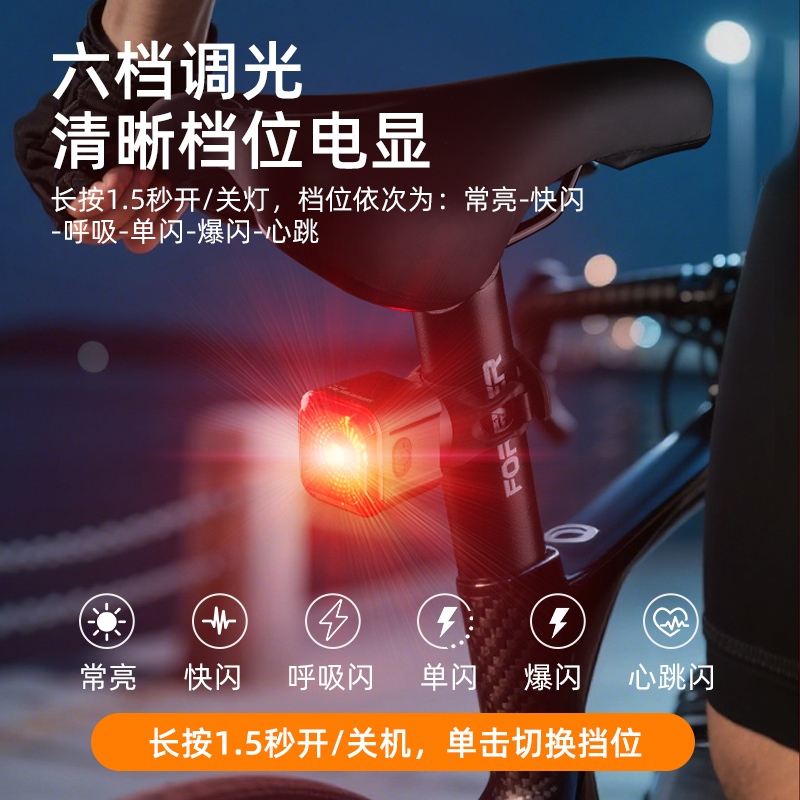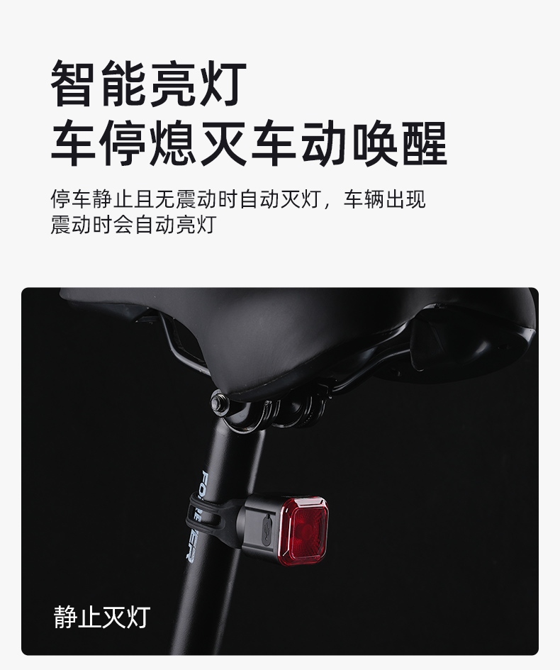 1、长按1.5秒开/关机,单击切换挡位:常亮一快闪一呼吸闪一单闪一爆闪-心跳闪; 2、刹车感应:刹车感应会随灯具开启自动启动,灯具关闭是也随之关闭; 3、自动启停:灯具静置40S左右会自动熄灭,检测到运动后自动亮起。