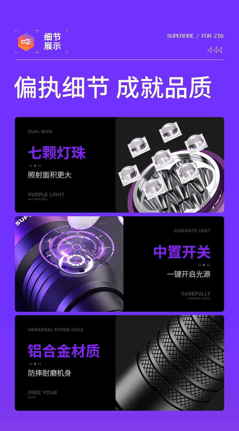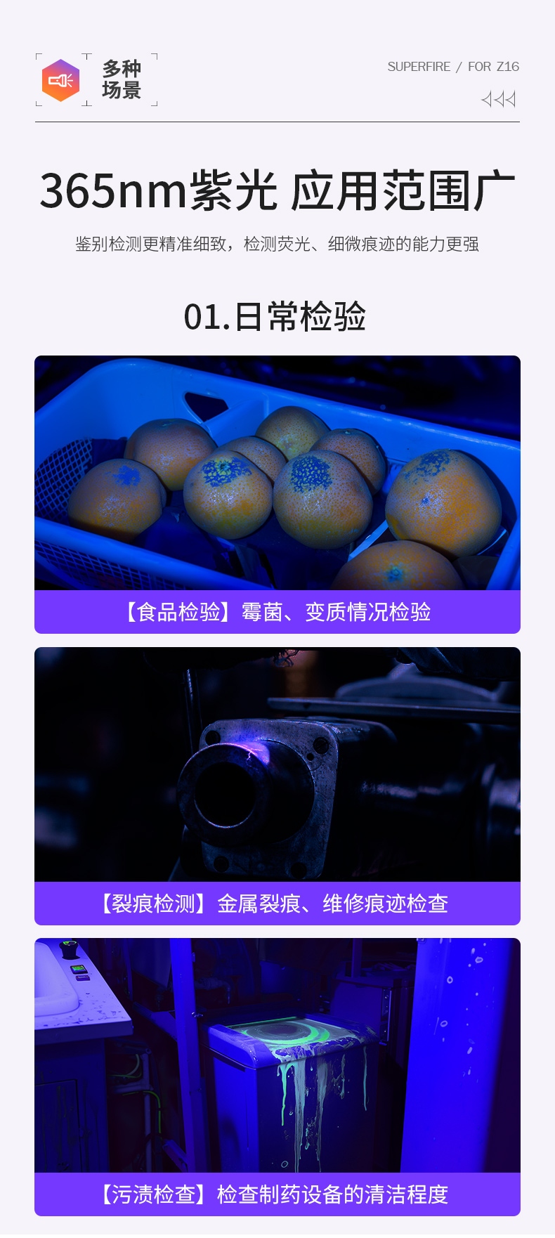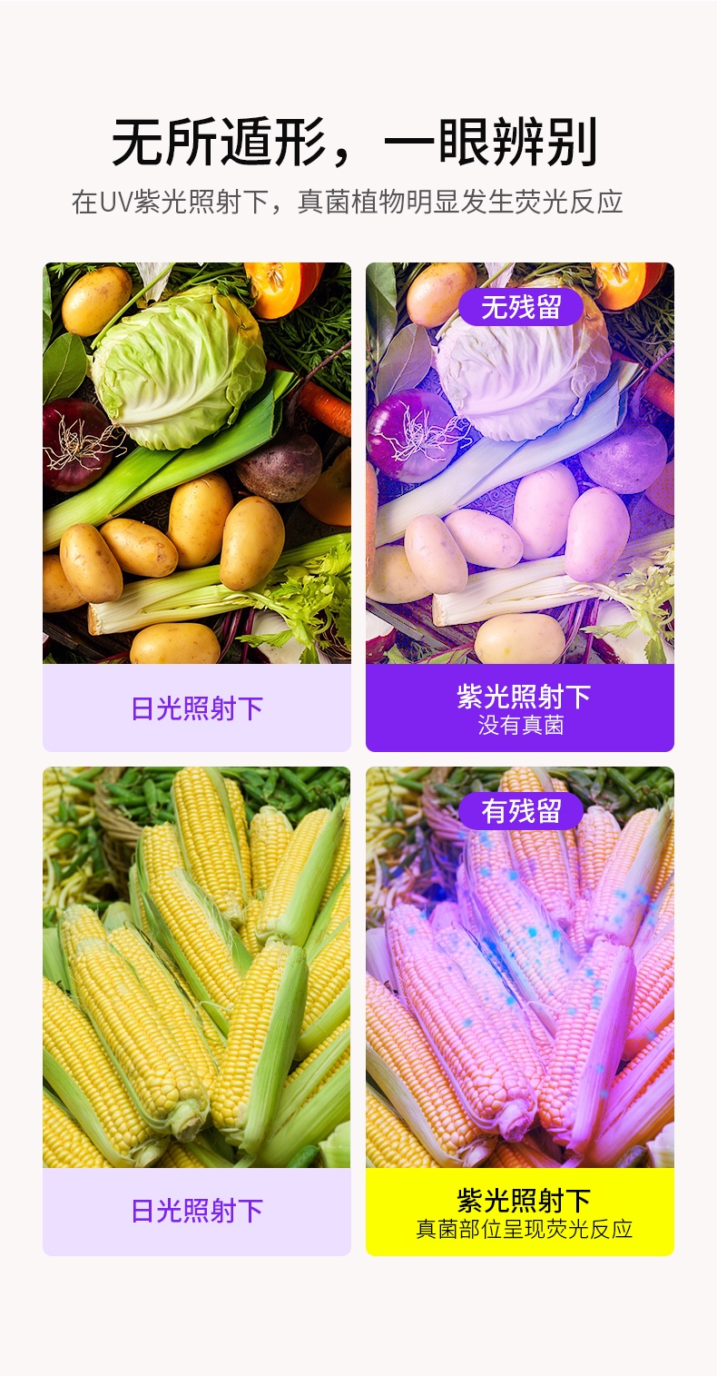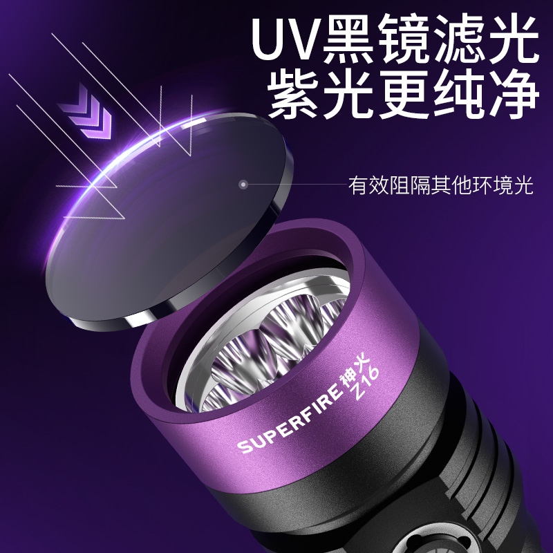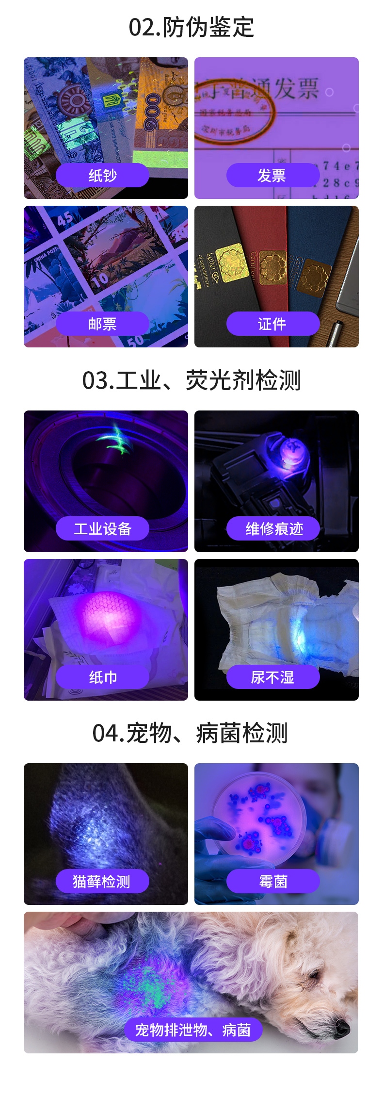 1、紫光手电,配有黑镜:可用于验钞、识别荧光剂,宠物病菌检测,鉴别琥珀、蜜蜡,古玩修补鉴定。