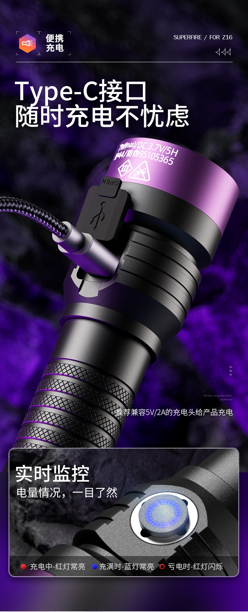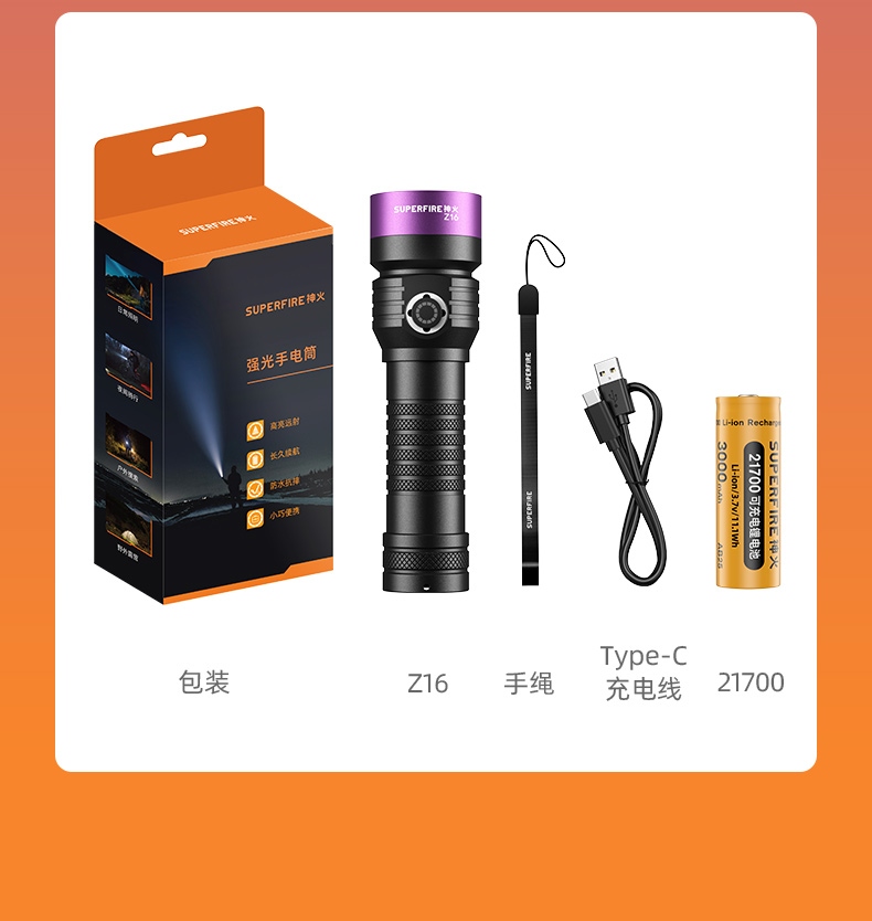 四档调光 Type-C充电 电量显示 铝合金筒身 持久续航 强力防水