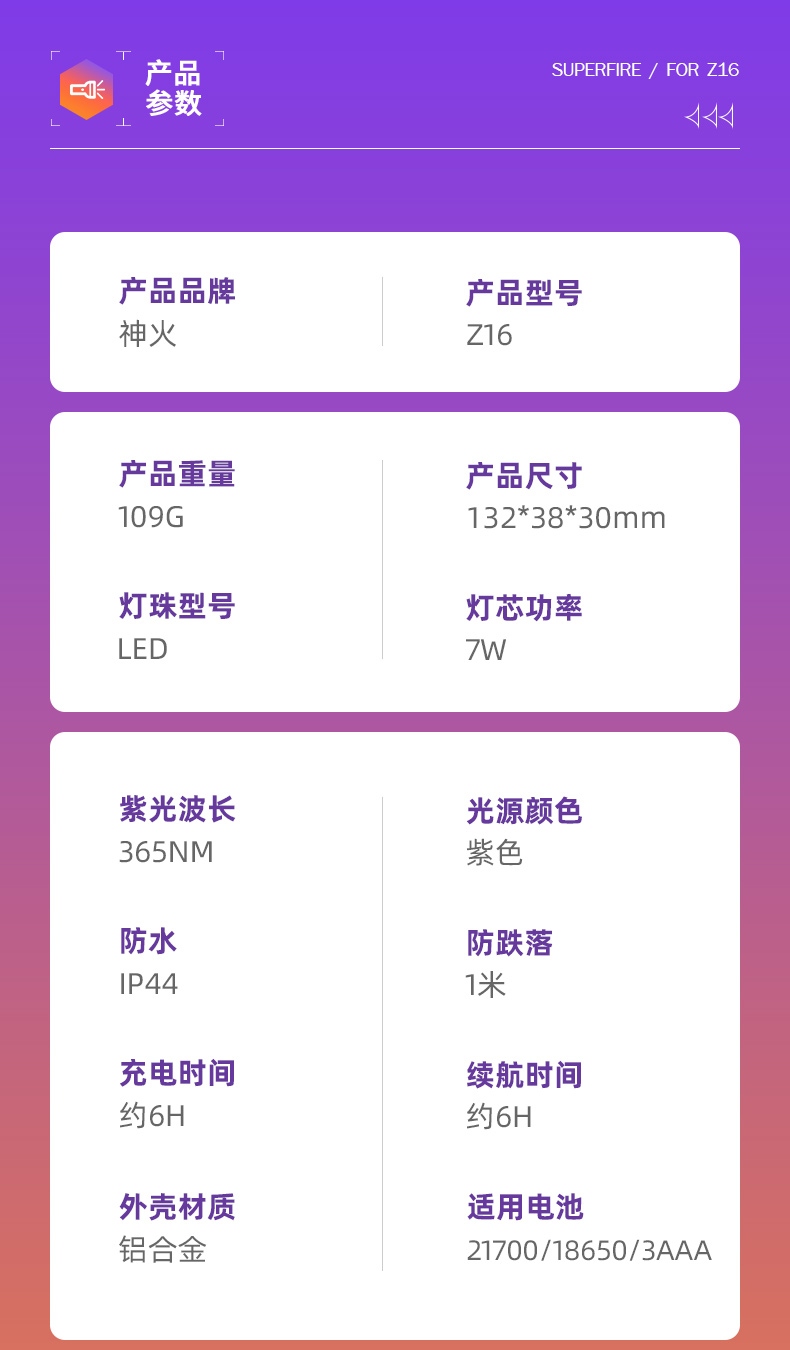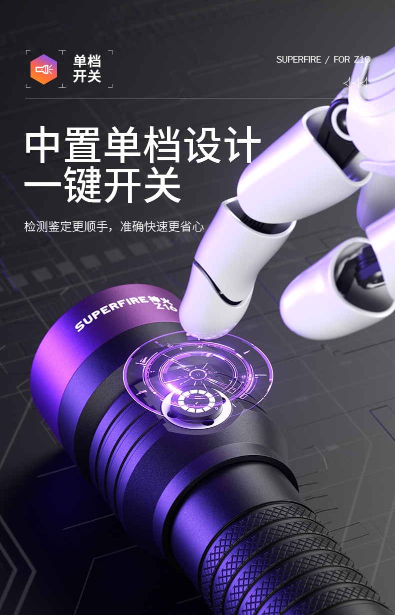 1、紫光手电,配有黑镜:可用于验钞、识别荧光剂,宠物病菌检测,鉴别琥珀、蜜蜡,古玩修补鉴定。 2、单档开关,操作便捷。 3、小巧精致,外出携带更方便。