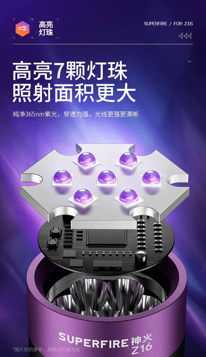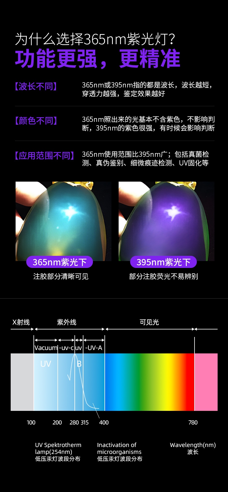 5、365nm紫光灯珠,波长短,穿透性更强。