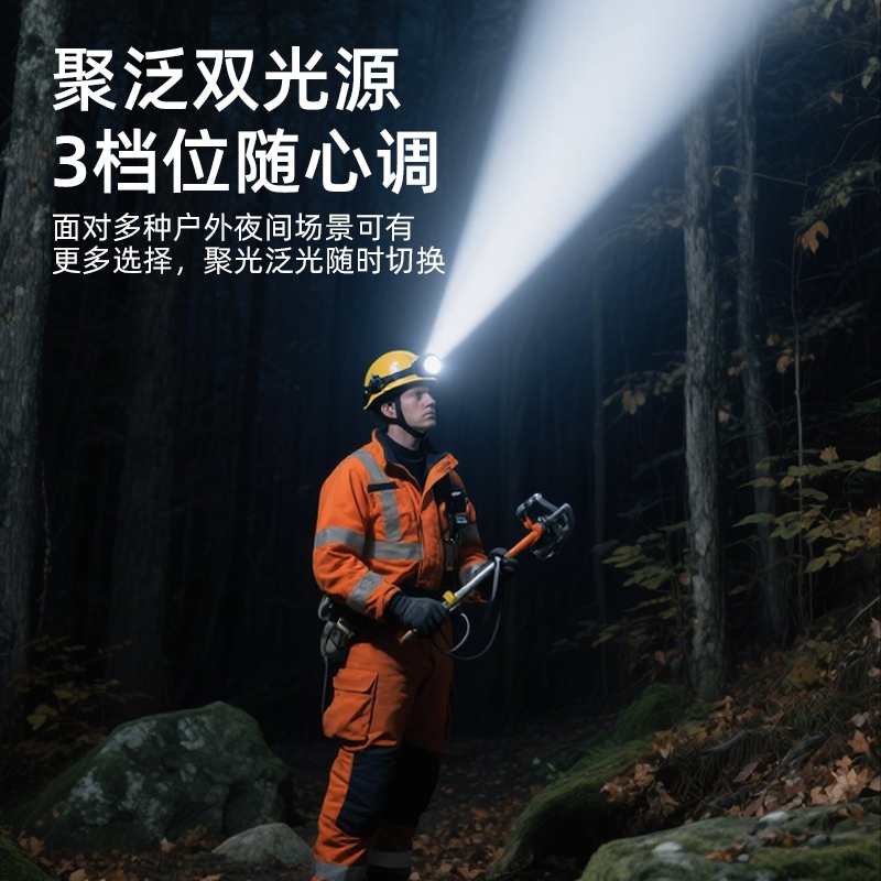 聚光主灯 亮度随心 轻按后端开关按钮,主灯强光点亮,续按依次切换主灯工作光-爆闪光。主灯开启状态下长按5秒,可实现光源色温转换。主灯关闭状态下长按5秒,可开启灯具最亮照明模式。 爆亮强光 亮如白昼 1500LM大功率高亮光源,点亮顷刻如白昼