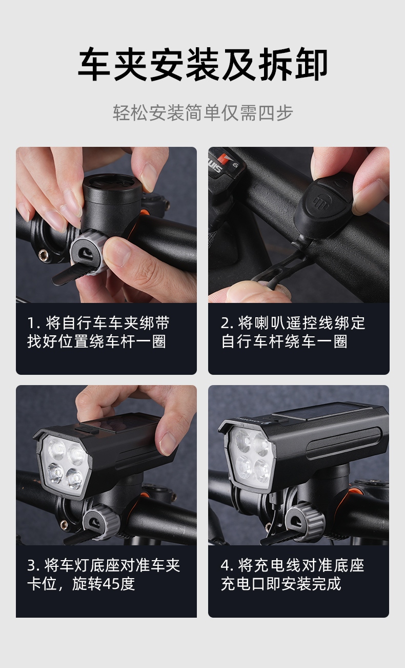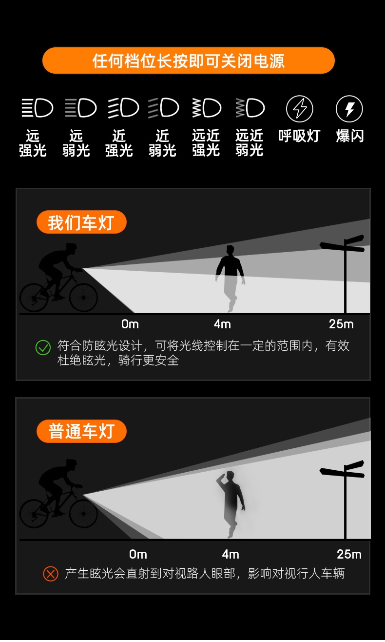 1、长按开关键开启光源,挡位顺序依次为:远强光-远弱光-近强光-近弱光-远近强光-远近弱光-呼吸灯-爆闪-关闭,任意挡位长按开关键关闭灯具。