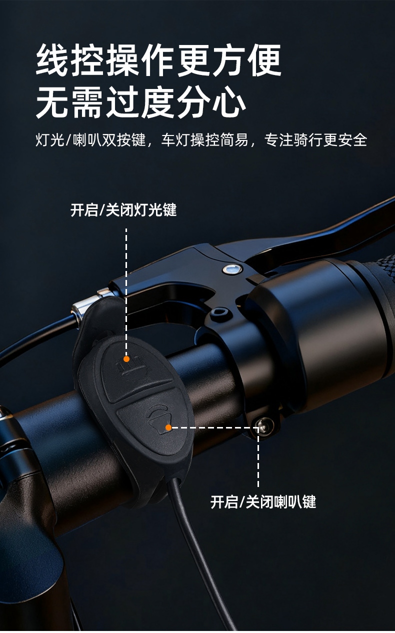 2,有线遥控器有两个按钮,其中灯光键和车灯按键一致,喇叭键可按压开启喇叭,快速双击可切换喇叭音效。