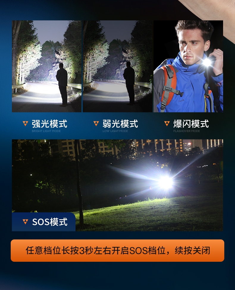 聚光主灯 亮度随心 轻按后端开关按钮,主灯强光点亮,续按依次切换主灯工作光-爆闪光。主灯开启状态下长按5秒,可实现光源色温转换。主灯关闭状态下长按5秒,可开启灯具最亮照明模式。 爆亮强光 亮如白昼 1500LM大功率高亮光源,点亮顷刻如白昼