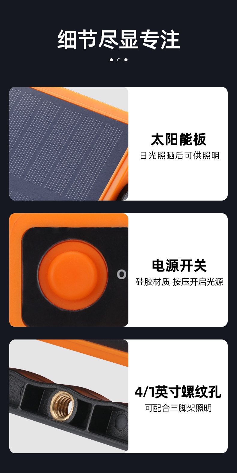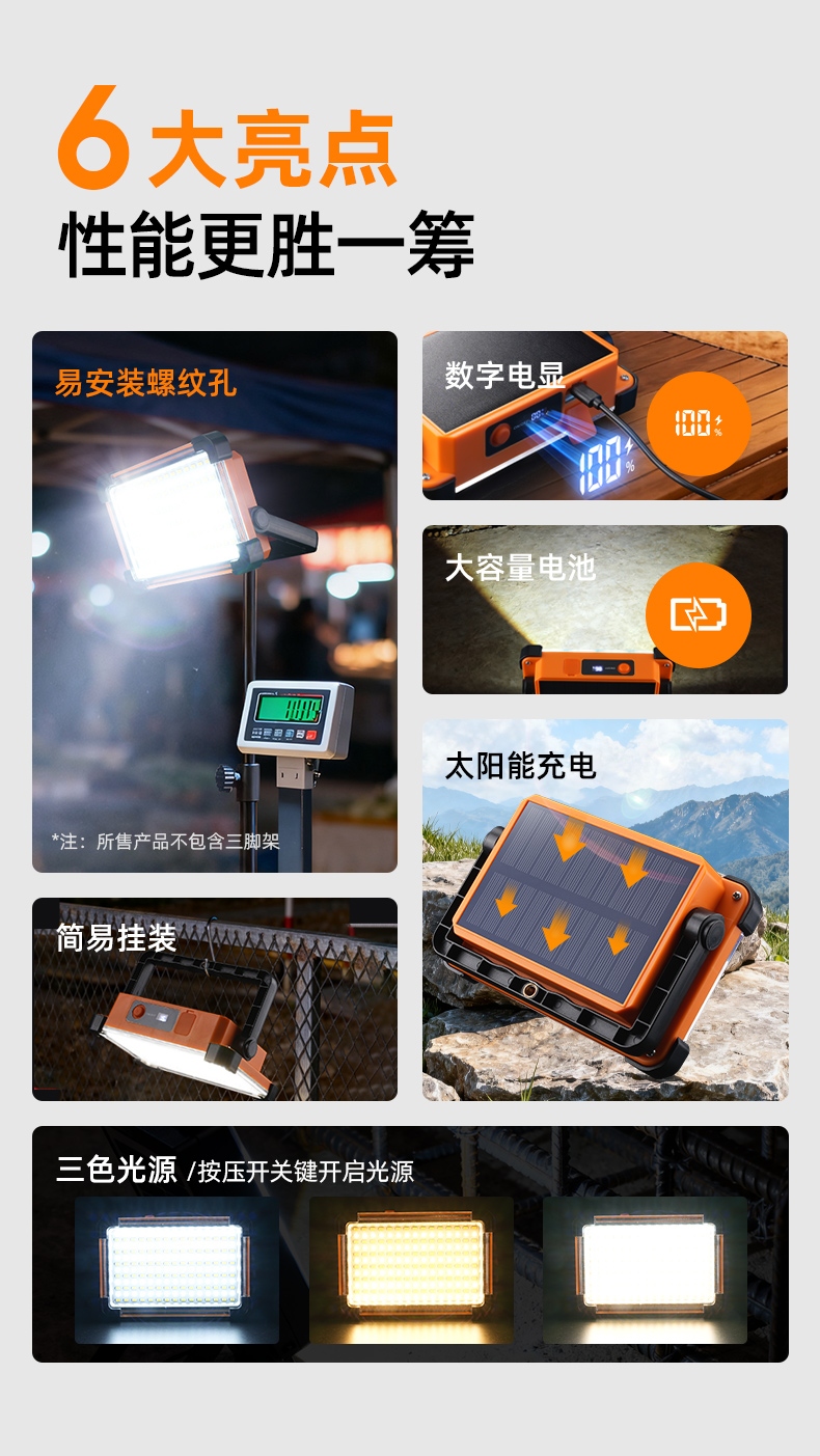 主要卖点:三色可调,数字电显,太阳能充电,大容量电池,4/1英寸螺纹孔,挂装。