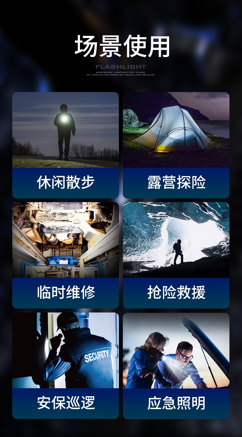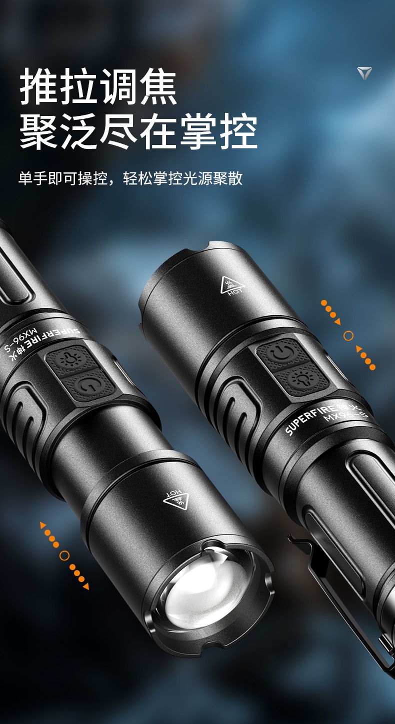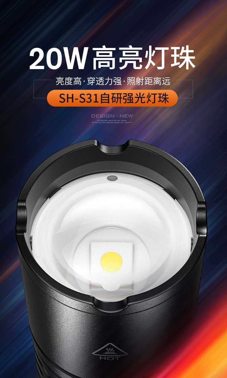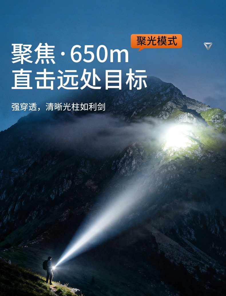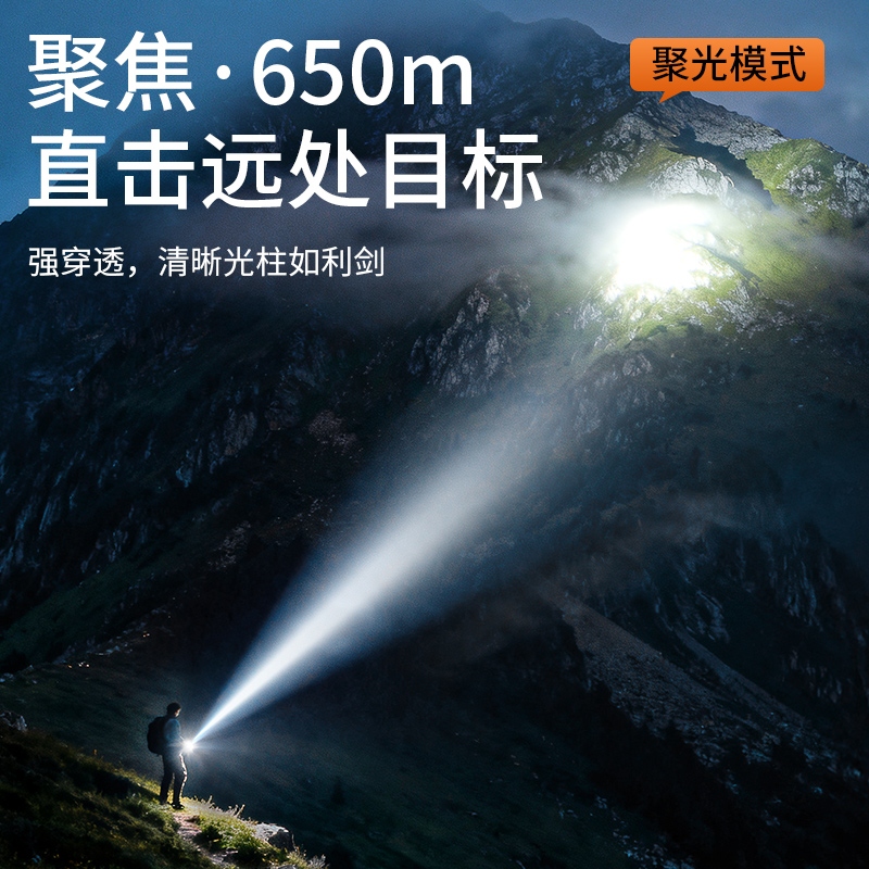 1、大功率灯芯,最高1350Lm最高亮度。 2、远射灯珠,最大650m照射距离。 3、推拉灯头,可实现伸缩调焦。