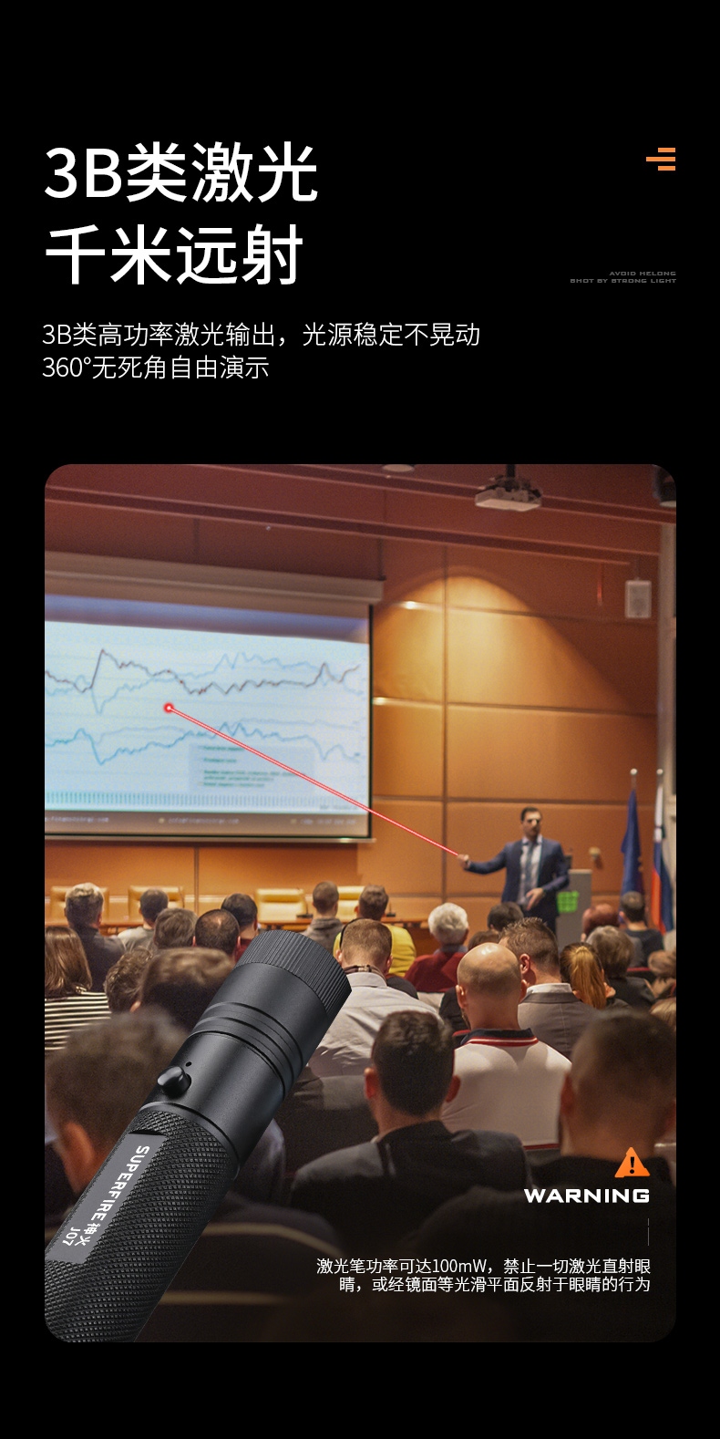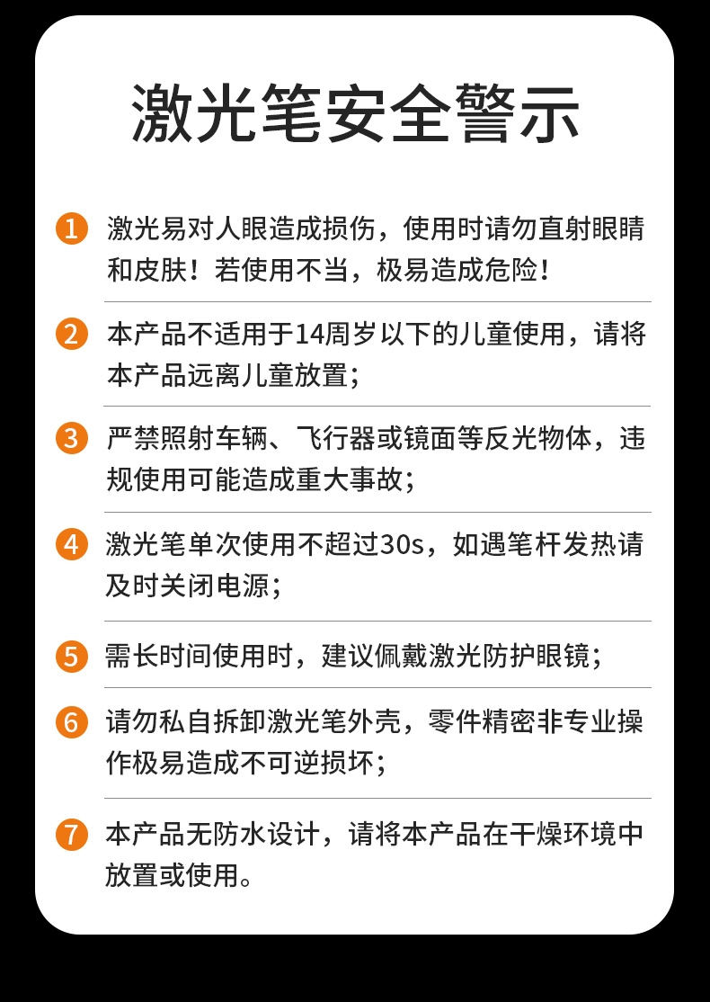 1、单射灯模式,红色激光笔可用于会议及教案宣讲,重点信息指引; 2、十字射灯模式,灯光绚丽,可玩性强。 3、铝合金外壳,稳定性好,耐压耐摔耐高温。 4、3B类激光,千米远射,光色纯,功耗低。 5、可调焦,光斑大小可调。
