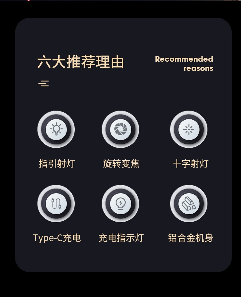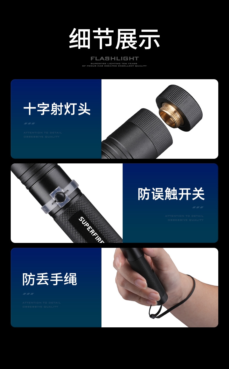 1、千米远射,射程更远,光斑更聚焦。 2、进口灯珠,亮度高,照明效果更好。 3、前后双按键,光源一键点亮,高亮瞬间开启。