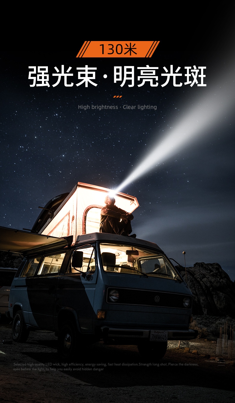 1、千米远射,射程更远,光斑更聚焦。 2、进口灯珠,亮度高,照明效果更好。 3、前后双按键,光源一键点亮,高亮瞬间开启。