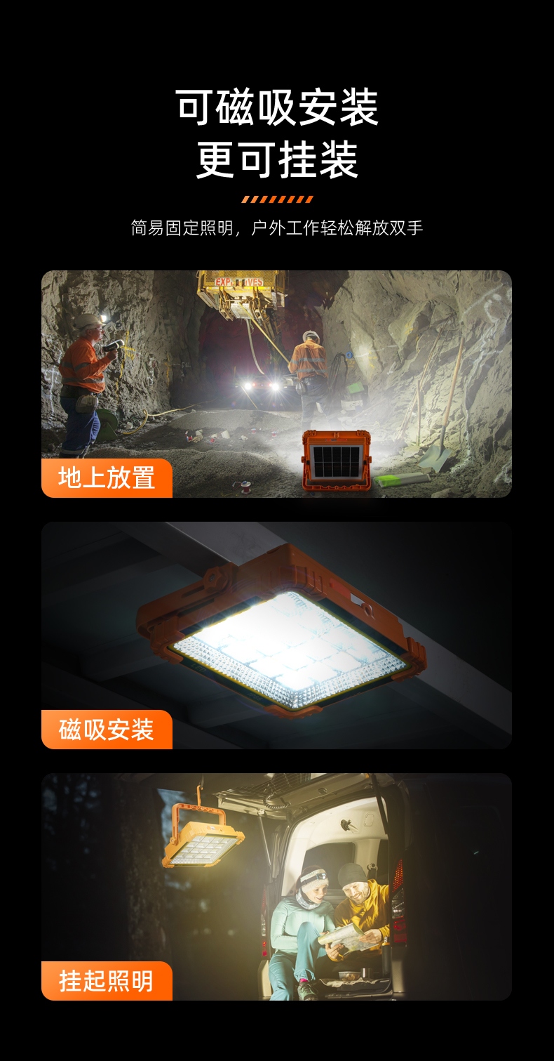 1、白光强、黄强光、黄白强光、黄白弱光、红蓝闪(警示灯)五档调节,可满足不同场景下的使用需求。 2、多样化充电,使用方便:设有Type-c充电口,可使用充电器、充电宝、电脑等设备为灯具充电。 3、此款投光灯背面带有挂钩、支架、强磁、使用方便。