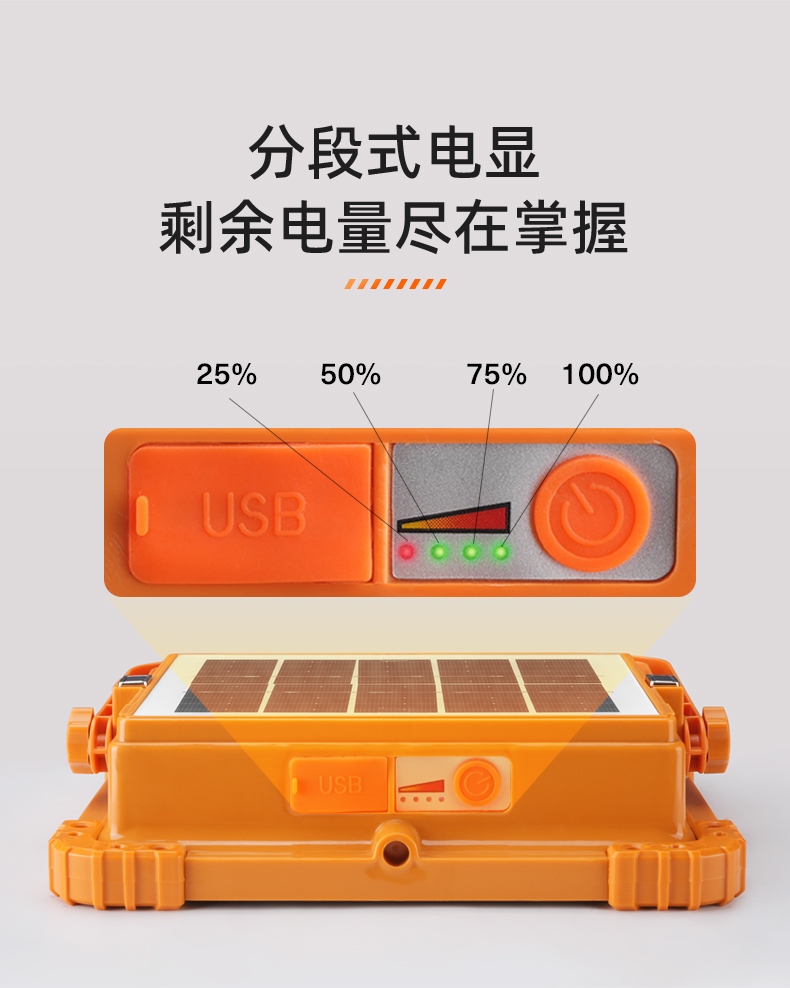 1、多档调光,可满足不同使用场景下的照明需求; 2、含提手,握感更舒适。携带更简单; 3、新型高亮远射灯珠,60W大功率,亮度高,照明效果好。
