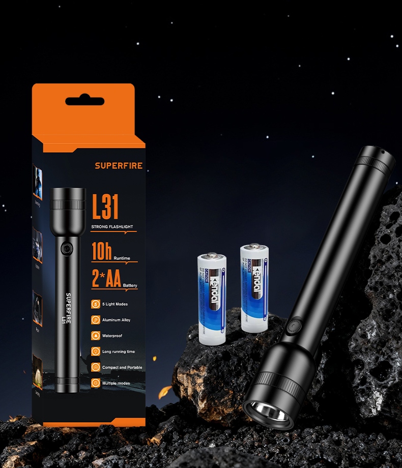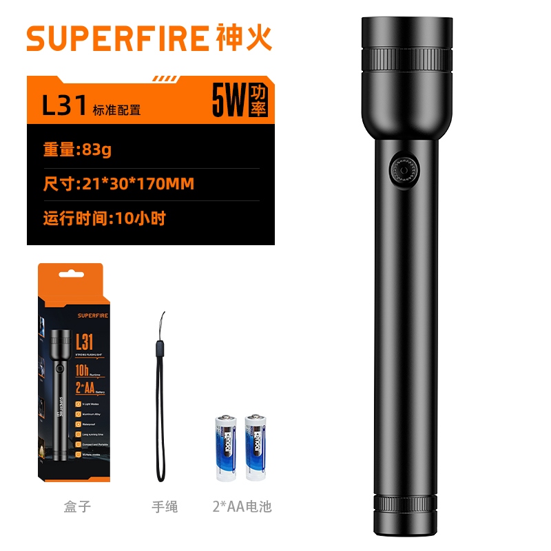 1、多档调光,满足不同使用环境下的照明需求。 2、配AA干电池,可随时替换,续航更长久。 3、铝合金筒身,防摔抗击。