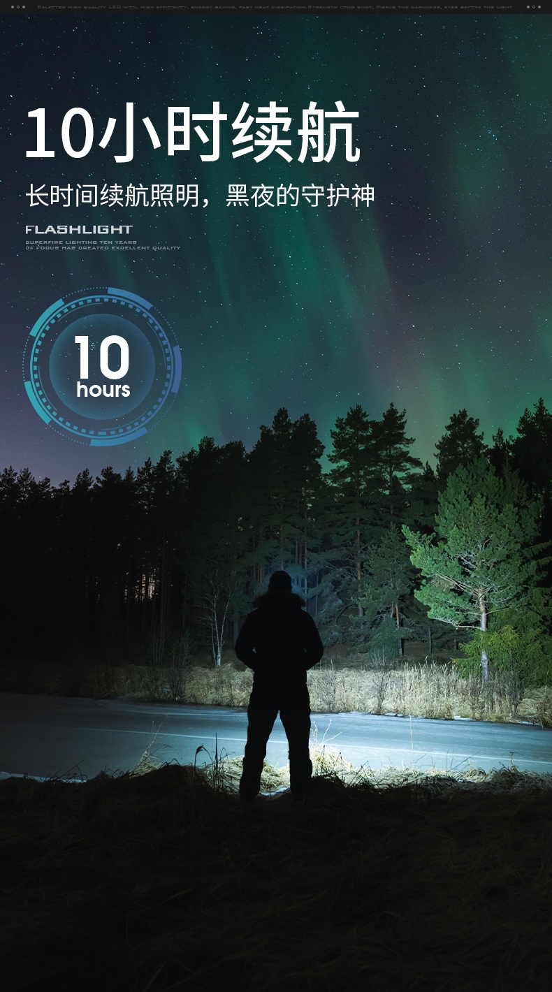 聚光主灯 亮度随心 轻按后端开关按钮,主灯强光点亮,续按依次切换主灯工作光-爆闪光。主灯开启状态下长按5秒,可实现光源色温转换。主灯关闭状态下长按5秒,可开启灯具最亮照明模式。 爆亮强光 亮如白昼 1500LM大功率高亮光源,点亮顷刻如白昼