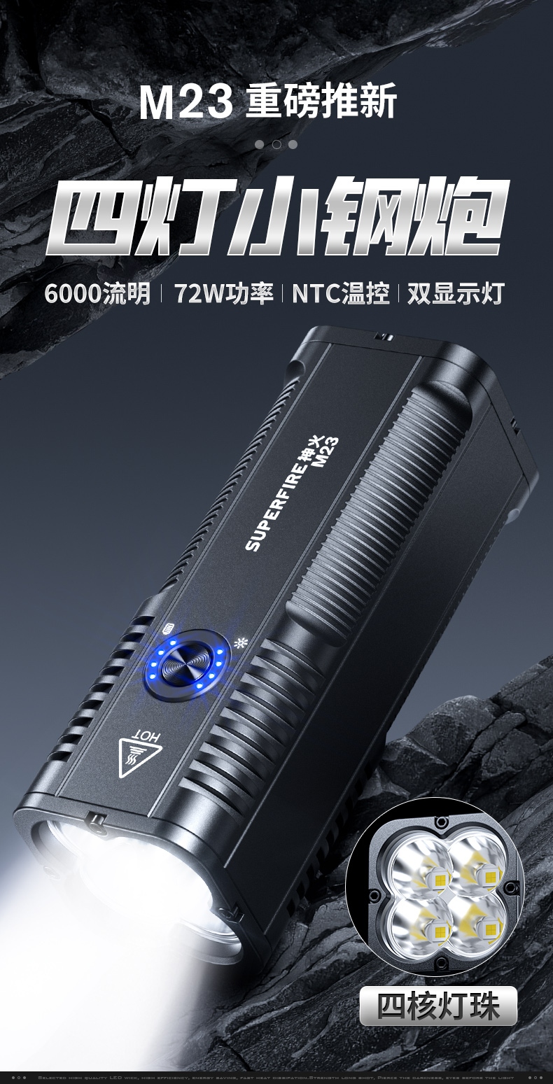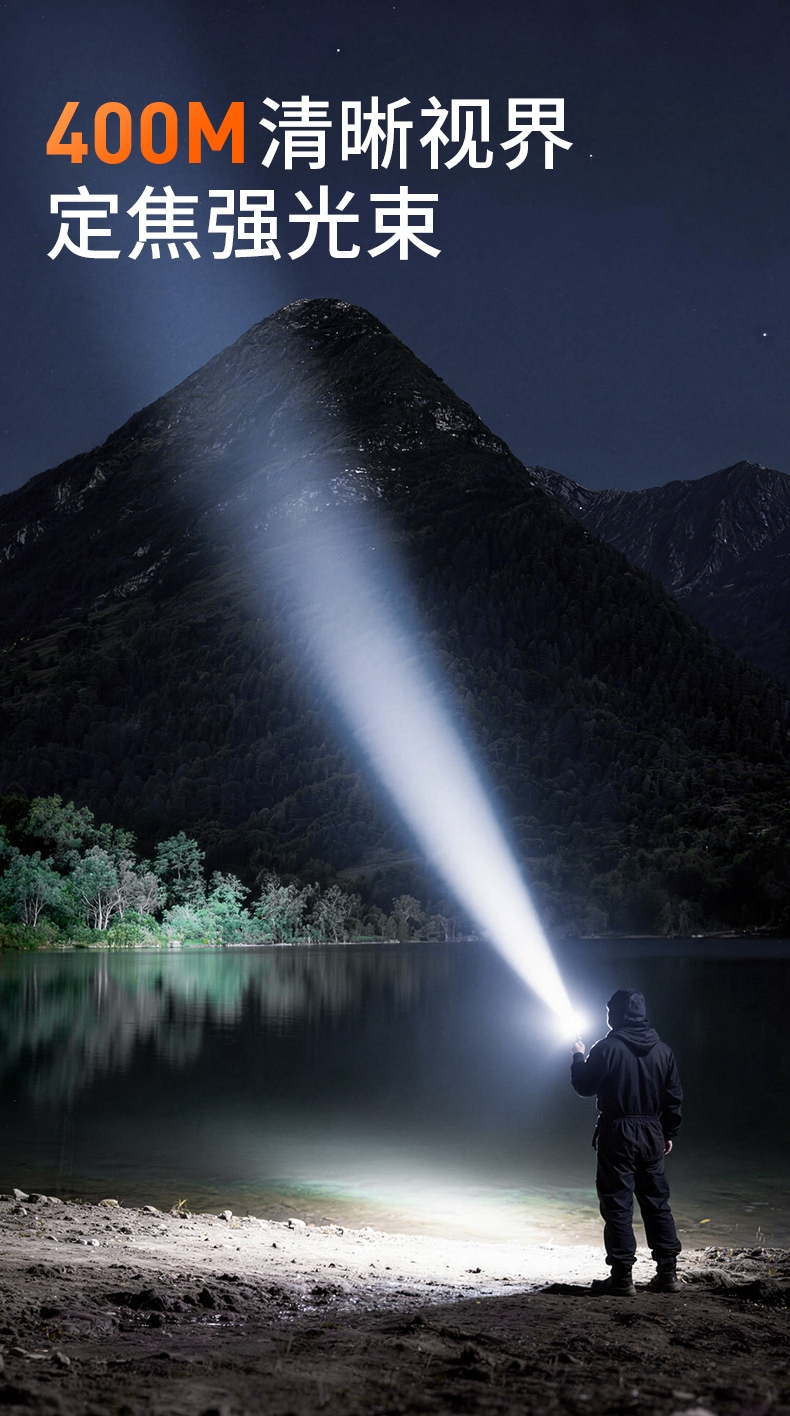 1、千米远射,射程更远,光斑更聚焦。 2、进口灯珠,亮度高,照明效果更好。 3、前后双按键,光源一键点亮,高亮瞬间开启。