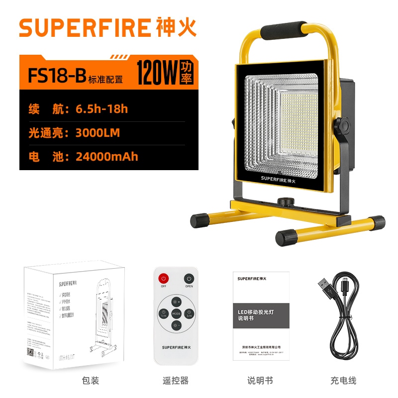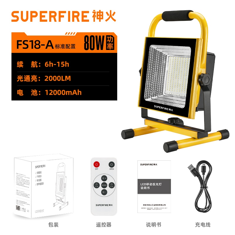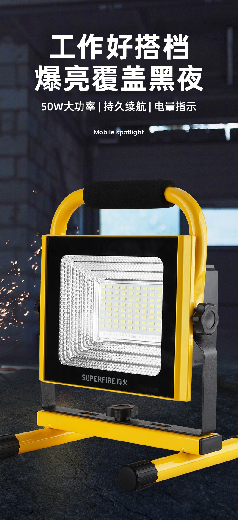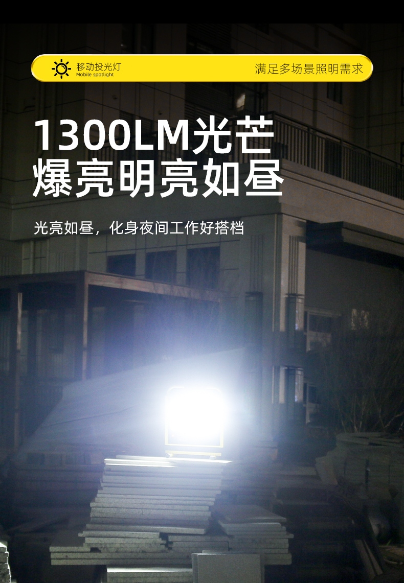 1、多档调光,可满足不同使用场景下的照明需求; 2、含提手,握感更舒适。携带更简单; 3、新型高亮远射灯珠,60W大功率,亮度高,照明效果好。