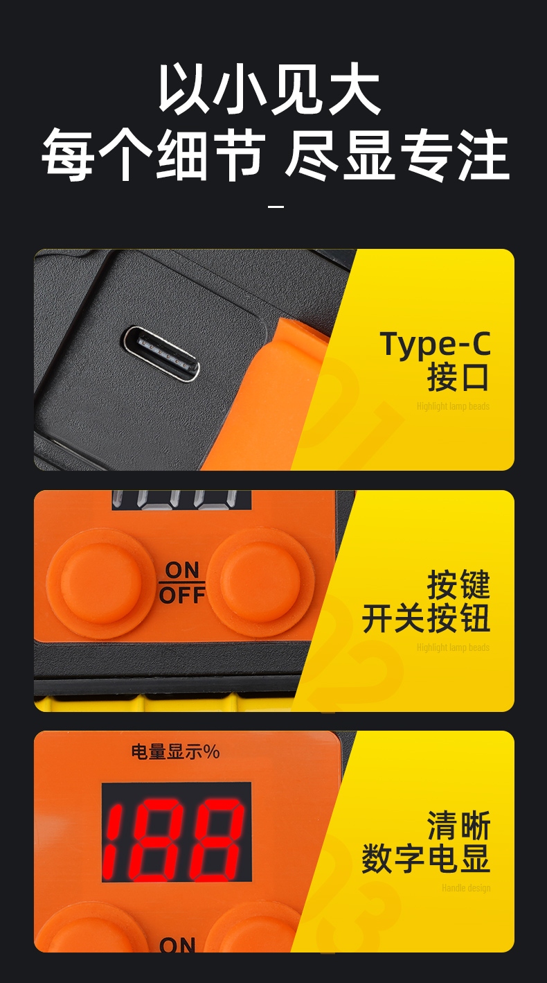高亮度,大容量,长续航,电量数字屏,强弱光调档,红蓝闪,无线遥控,定时照明,阶梯调光。