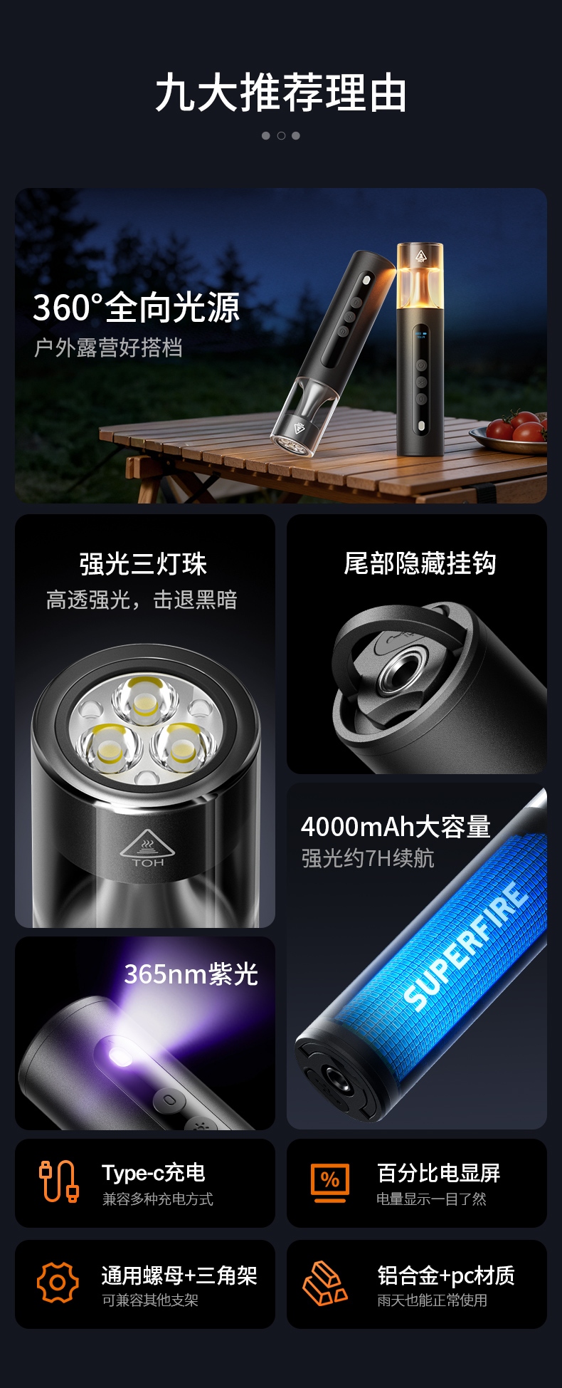 1、前灯+侧灯+紫光、3种照明模式,多档调光,可满足不同使用场景下的照明需求。