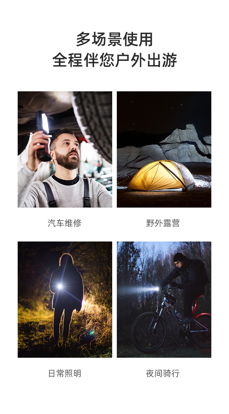 聚光主灯 亮度随心 轻按后端开关按钮,主灯强光点亮,续按依次切换主灯工作光-爆闪光。主灯开启状态下长按5秒,可实现光源色温转换。主灯关闭状态下长按5秒,可开启灯具最亮照明模式。 爆亮强光 亮如白昼 1500LM大功率高亮光源,点亮顷刻如白昼