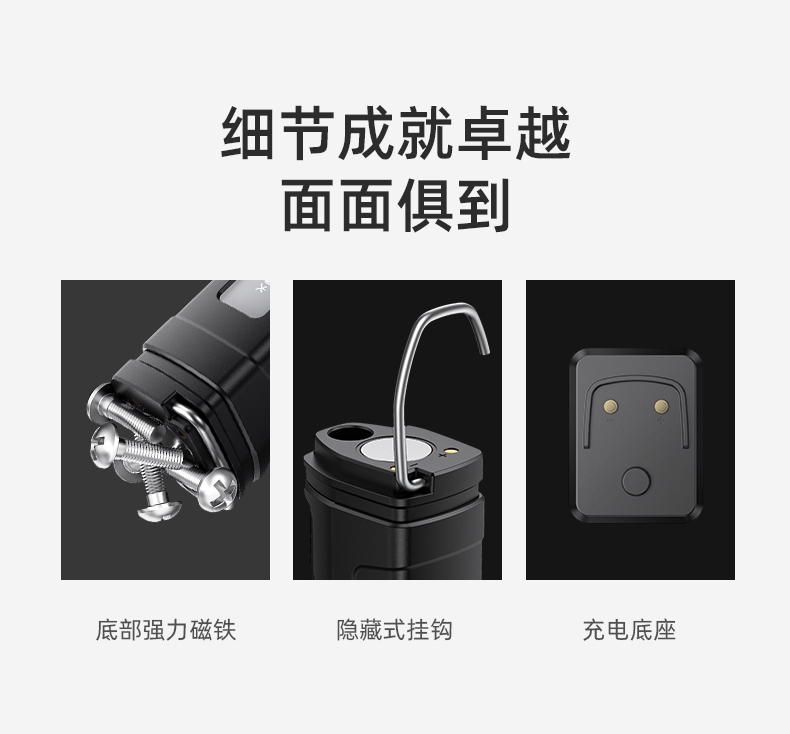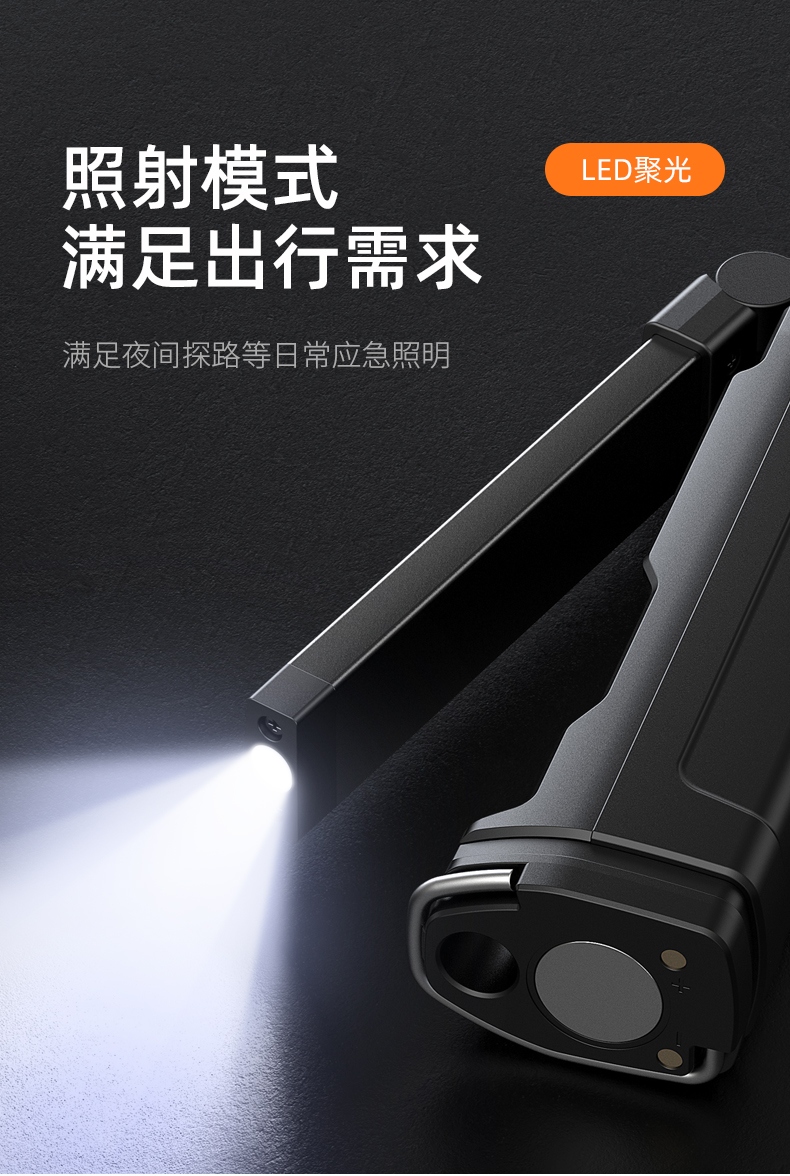 3、此手电设有磁吸、挂扣及伸缩固定架,多种固定方式满足工作需求.