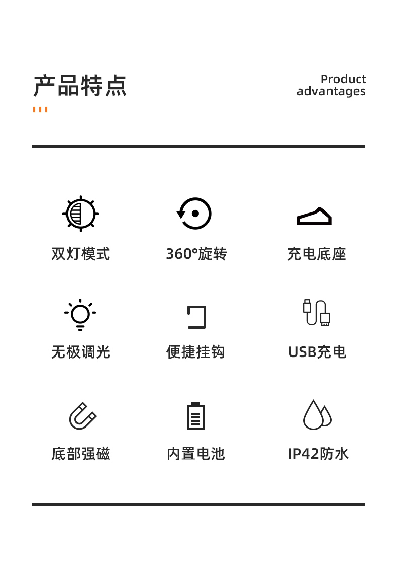 1、六档调光,可满足不同使用场景下的照明需求。 2、进口高亮朗明纳斯灯珠,照明效果更好。 3、含档位记忆,任意档位快捷关机 ,开机恢复关机前档位。