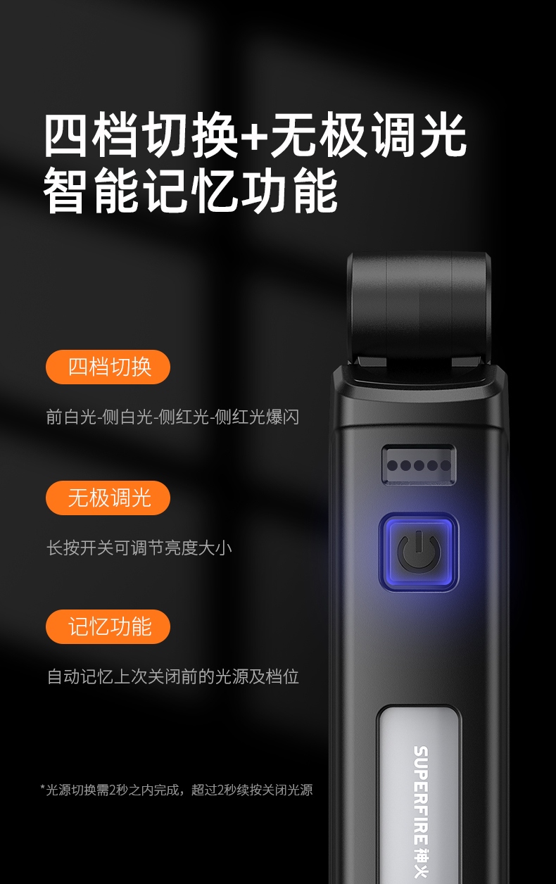 1、此款工作灯有记忆功能,自动记忆上次关闭前的光源及档位;