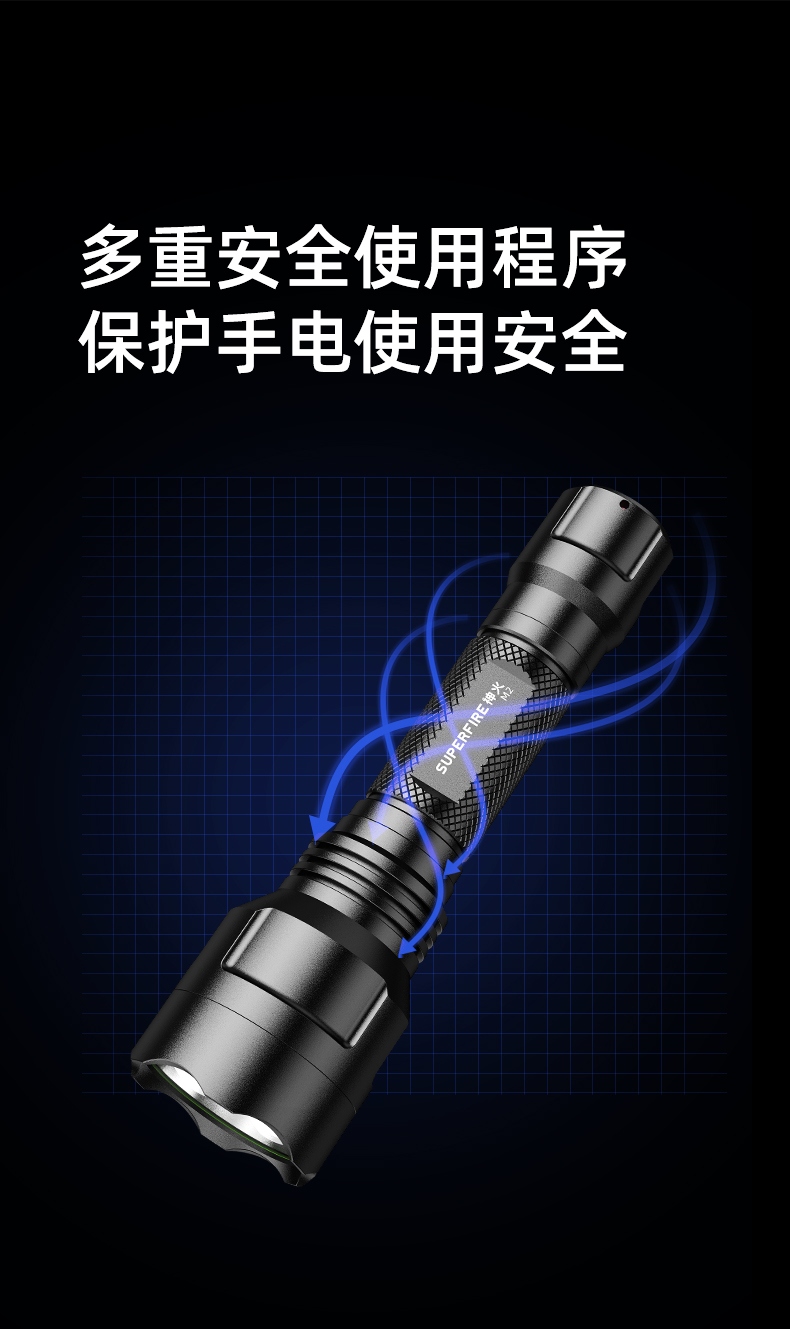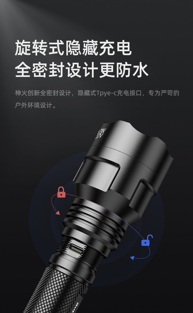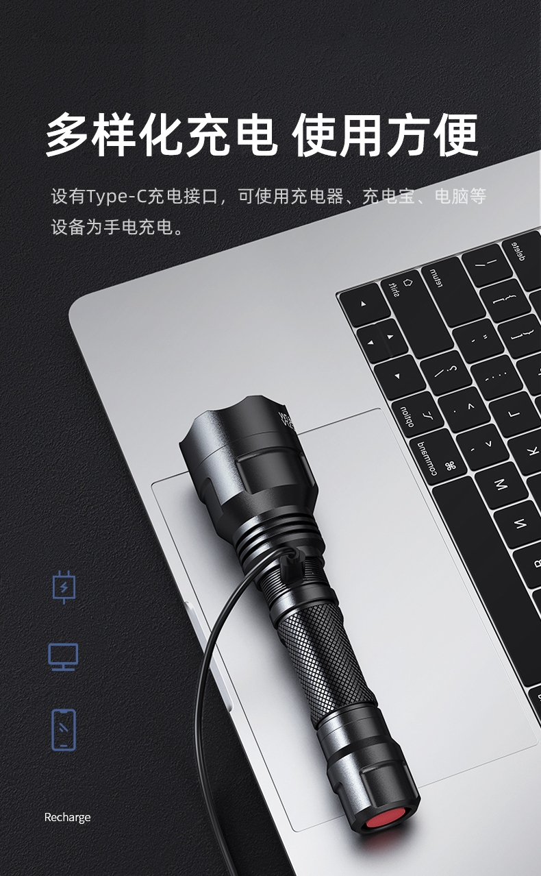 多样化充电,设有Type-C充电接口,可使用充电器、充电宝、电脑等设备为手电充电;设有省电程序,续航更持久