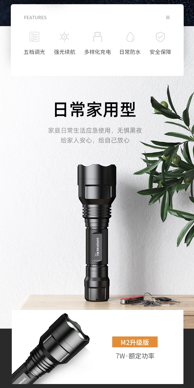 1、六档调光,可满足不同使用场景下的照明需求。 2、进口高亮朗明纳斯灯珠,照明效果更好。 3、含档位记忆,任意档位快捷关机 ,开机恢复关机前档位。