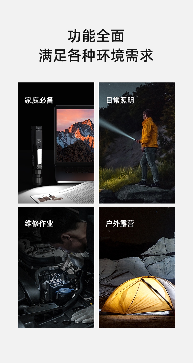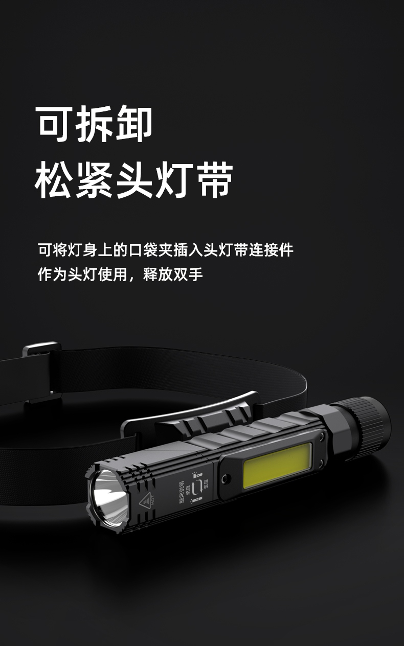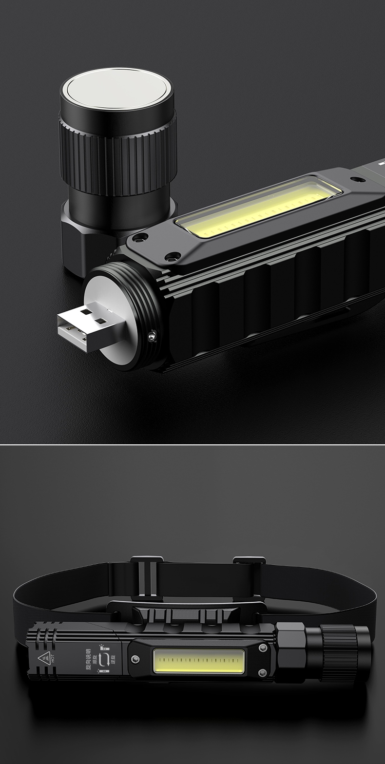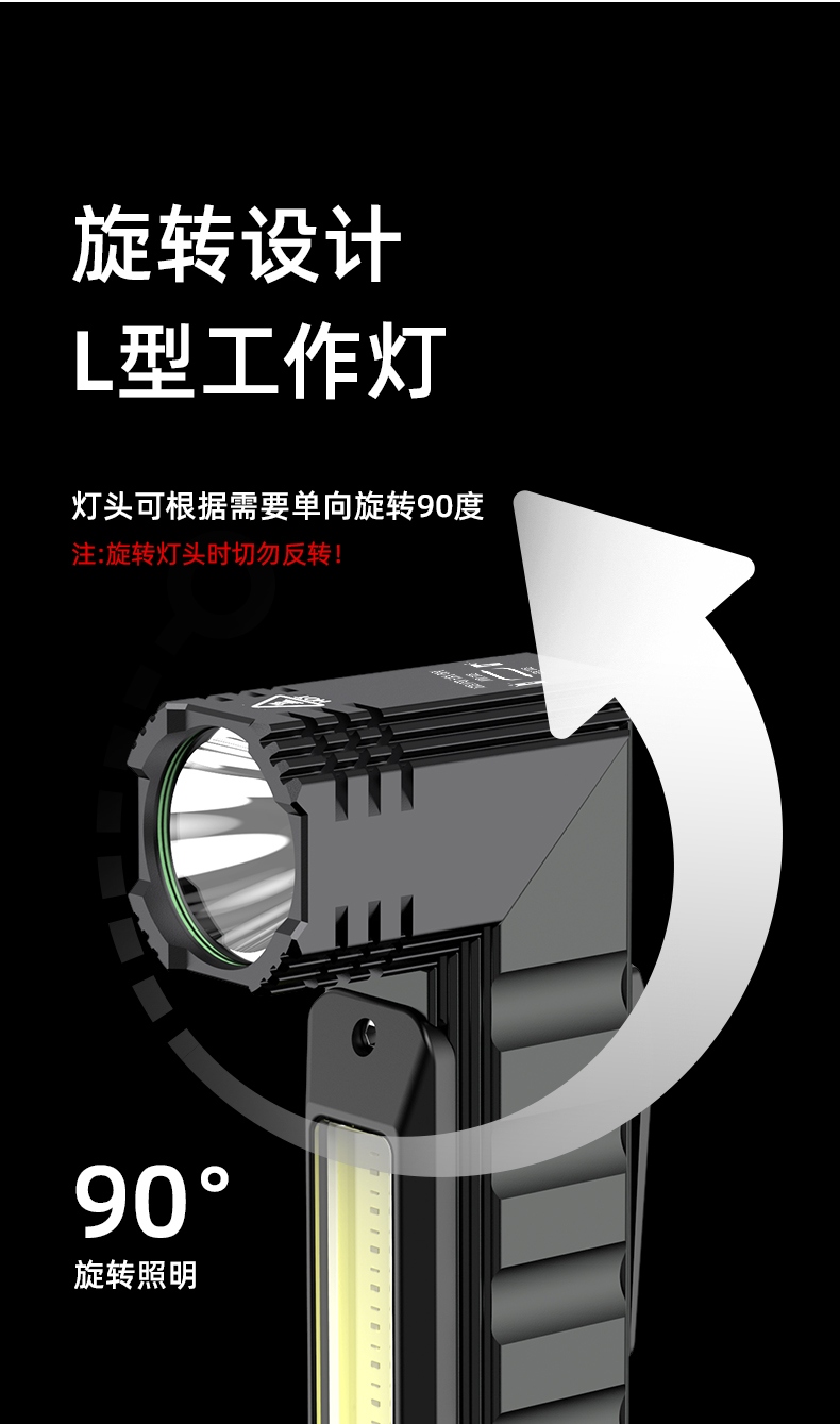 多功能旋转手电(2种光源:白/红光)头部90度旋转、可当头灯、带侧灯、腰夹,底部磁铁可根据不同场景调整照射方向。适用多种场景日常户外、工作检修、家庭应急等